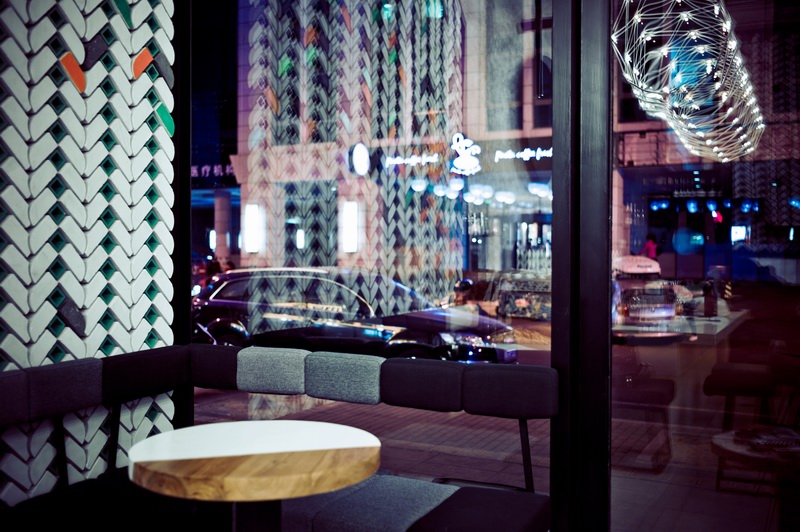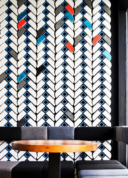 酒吧最醒目的特色之一是墙上的人字形花砖装饰,砖块取自老北京胡同里常见的青砖,经过切角改造,对接而成。砖块拼接好后被涂上各种色彩点缀,在产生完美装饰效果的同时,部分还当做酒架处理。