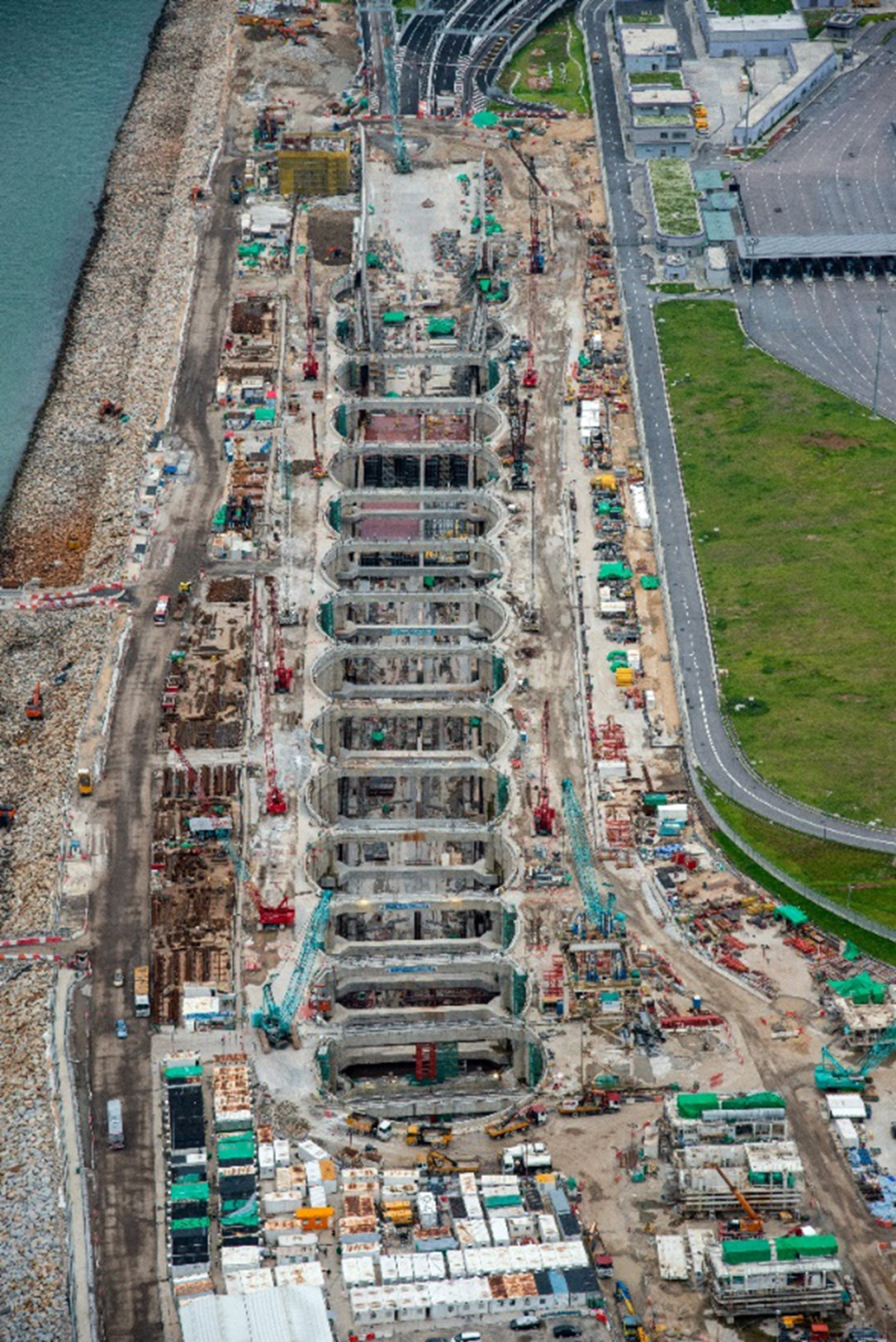 ◎项目还建造了全球首个以15个环状组成、长达500米、深达43米的围堰,称为“环型连续墙”,也是香港最大的环型垂直连续墙结构。