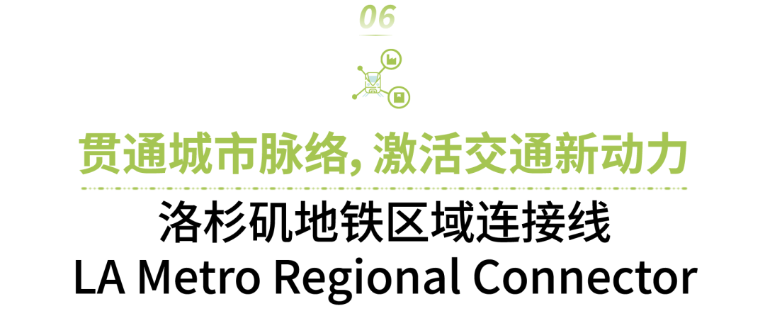 洛杉矶地铁区域连接线项目是改善洛杉矶公共交通网络的重要升级项目。项目全长约3公里,通过新建三座地铁站,打通市中心三条主要线路,令乘客可从洛杉矶东部克莱蒙特小镇(Claremont)直达观光胜地长滩(Long Beach),或从东洛杉矶直达海滨城市圣莫尼卡(Santa Monica),实现“一票直达”长距离出行,覆盖范围最长达80英里。