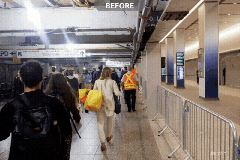 第二阶段:扩建长岛铁路站厅– 提升旅客体验 (2023年完工):通过向北迁移零售店铺,改造后的站厅宽度近乎翻倍,旅客通行空间大幅提升;针对原大厅 “碰头梁”(低至约 1.98 米)的技术难题,团队创新设计结构框架,移除横梁后将天花板升至约 5.49 米,且全程不影响轨道正常运营。