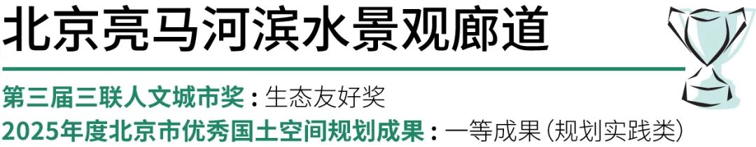 在设计过程中,项目团队以周边企业及居民的需求为切入点,提出“建筑-绿地-水体,三者无缝衔接”的创新理念,使后方功能可以延伸至水岸空间,也使得水岸景观可以不断延伸生长。亮马河两岸沿线原本破碎、不成系统的公共空间被重新整合为一条拥有特色多元的滨水慢行系统、丰富多样的驳岸形式以及完备的公共服务设施的5.5公里长的蓝绿风景廊,并成为北京市民触手可及的门前“绿水青山”。