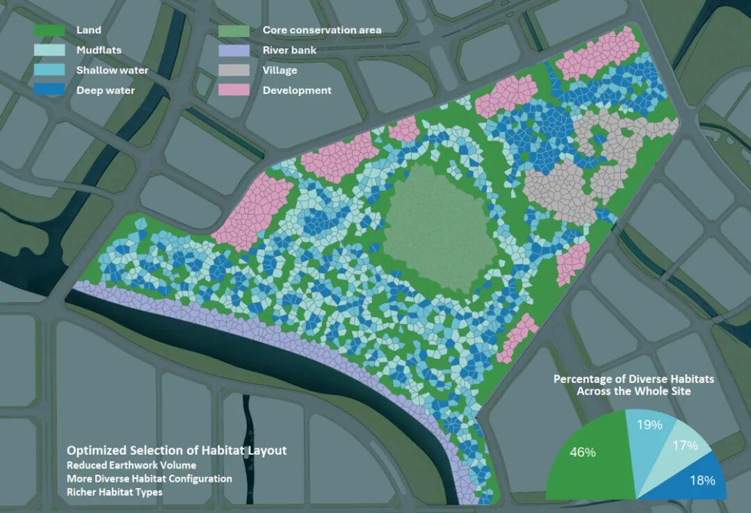 基于理想生态横截面,将多样生境的空间关系转化为机器逻辑,并结合概率工具生成多种参数化布局,最终选出优化版本。