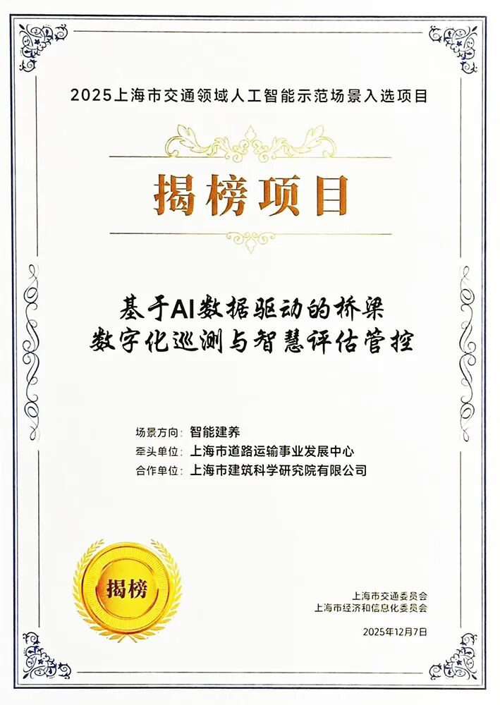 近日,上海市建筑科学研究院有限公司(以下简称为“建科院”)在交通基础设施智慧运维领域斩获两项重要荣誉:一是联合上海市道运中心申报的“基于AI数据驱动的桥梁数字化巡测与智慧评估管控”项目,在交通运输部及上海市交通委员会指导的“‘人工智能+交通运输’上海发布2025”活动中,成功入选上海市交通领域人工智能示范场景揭榜项目;二是建科院牵头申报的“‘河图·桥语’:桥梁监测数据分析-评估-决策一体化智能算法集群”项目,在中国公路学会主办的“交通基础设施结构监测技术创新大赛”中,经过与全国48家决赛入围单位的角逐,最终荣获一等奖。