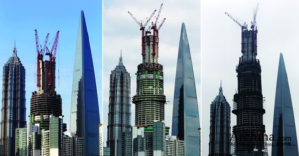 建设中的上海中心大厦(中)不断长高,现已超越金茂大厦(左)和环球金融中心大厦(右)(拼版照片,从左至右分别摄于2012年5月27日、2012年10月11日、2013年3月13日)。