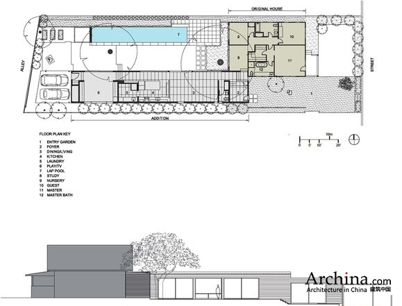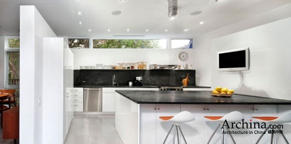 这座住宅原建于1917年,是一座平房,房间面积不大,窗户也很小。改造后,大幅玻璃板嵌入到立面上,并增加了一座新的附楼,向后院的池塘打开。附楼安装了落地滑动玻璃板,能够与外围空间连接在一起。附楼粉刷成白色,与老楼区别开来,后者是用绿色粉刷的,与场地上葱绿的植被色调吻合。