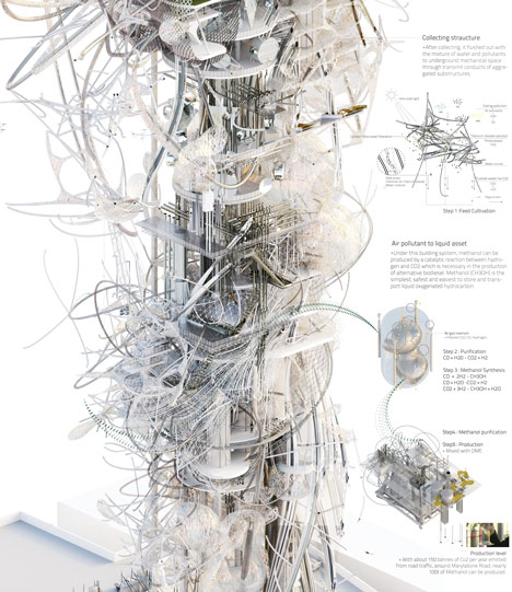 皇家艺术学院毕业生Chang-Yeob Lee提出了一个设计概念,将伦敦电信塔(BT Tower)改造成一座攫取污染的高层。该项目被称为Synth[e]tech[e]cology,最终将把现用于电信的189米高的塔改造成一座生态大楼,收集悬浮污染物且帮助降低伦敦的呼吸系统疾病发病率。过程还包括提取汽油中的碳用于生产可持续生物燃料。塔楼的外部将作为巨大的生态催化转换器,而内部可以放置用于调查如何增强空气流动和提高转换效率的研究设备。