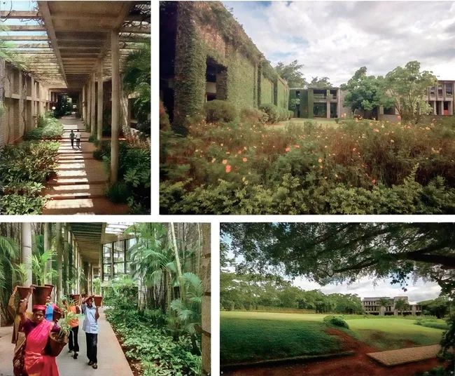 我只重点举一个例子,一个极具象征性的例子——印度管理学院班加罗尔分校。这座庞大的校院建筑远看柯布味道很浓:架空底层、自由平面、自由立面、屋顶花园……然而细看你会发现柯布的诸多特征都以一种印度式的夸张被推向极致:架空底层、自由平面、自由立面,与南印度寺庙中常见的彼此联通的高大连廊嫁接在一起,变成一种几乎取消了墙的藤架结构;一切能够打开的都被打开了,只留下最最基本的使建筑物之为建筑物的围合空间;而正是由于这种相当彻底的开放性,柯布的屋顶花园也以极致的形式呈现,那就是几乎包裹住整座建筑的丛林,以及那些生命力极其旺盛的似乎拼命要挤进建筑物里来的绿植;柯布为了应对印度的炎夏而设计的并不怎么实用的遮阳板,也因为高大的藤架结构和攀缘其上的绿植的遮荫效果而失去了存在价值(据说在那个开敞空间里无需空调就很阴凉),但它密集的平行线视觉效果多少在藤架结构中保留了下来。多西说:“校园也应如圣所一般,没有边界、没有门,满足人们沟通、交互的需求。”柯布作为一个本能地重视人际距离的欧洲人所难以想象的摩肩接踵式的高密度、高频次印度社会生活,由此被多西引入建筑,而“当开放性空间主导时,建筑形式便消隐了”。