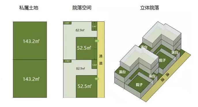 1、在相同容积率和建筑密度情况下,院墅产品较传统联排产品在院子展开面、院子舒适度、院子私密性上均有较大提升。