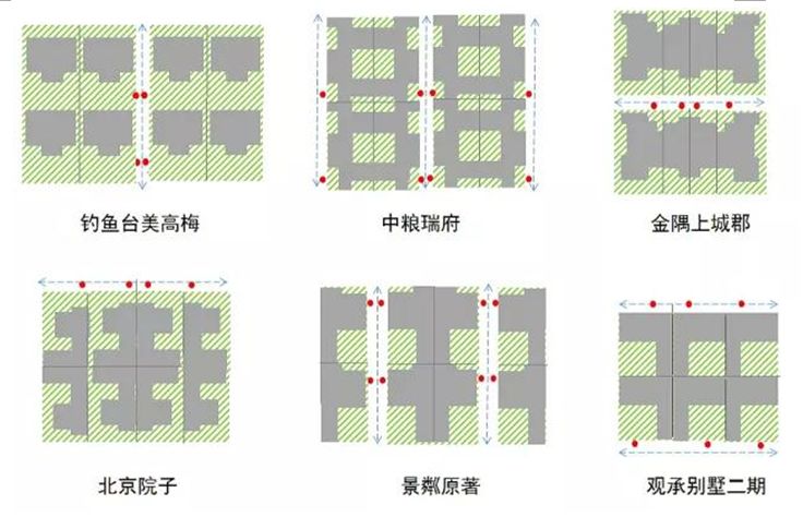 我们把近两年北京部分项目的规划总图放在一起看,发现在产品规划布局上的新规律:以U型或L型合院产品,进行南北向连接。利用南北向日照间距,规避日照间距与山墙间距,有效节约宅间空地。