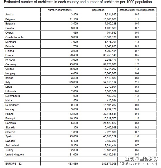 Europe - 32 has an estimated 483,000 architects.One quarter (25 per cent) of architects are based in just one country; Italy. The second highest number of architects is recorded in Germany,accounting for 20 per cent to of the Europe total.Third highest is Spain, with 45,000 architects and three countries - Turkey, the UK and France – have around 30,000 architects each (between 6 and 7 per cent of the Europe total). So these six countries together account for 74 per cent of all of Europe’s architects.