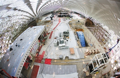 正在内部装修施工的T3航站楼,看上去非常宏伟壮观。