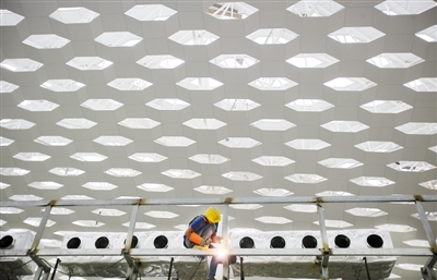 “大”体现在T3航站楼的大厅及中心指廊的开阔空间。为了实现空间的开阔,整个T3航站楼钢结构施工的体量超过5万吨。