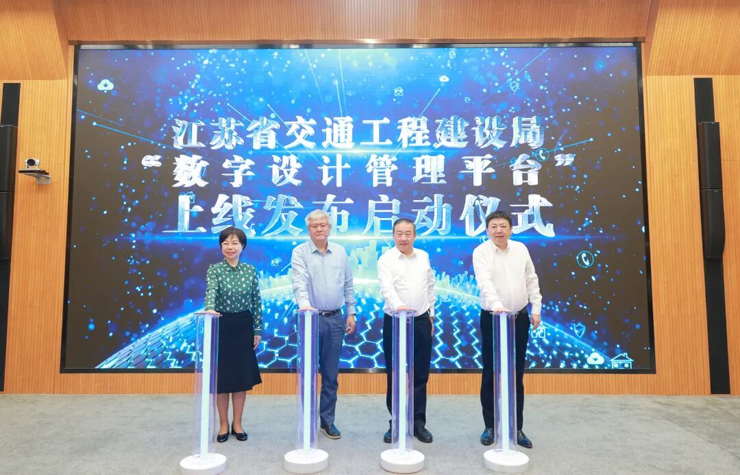 省交通运输厅党组成员、省交通工程建设局局长蒋振雄,中国公路勘察设计协会副理事长李志军,省铁路办二级巡视员、省交通工程建设局副局长缪玉玲,华设设计集团董事长杨卫东为“数字设计管理平台”上线发布启动。