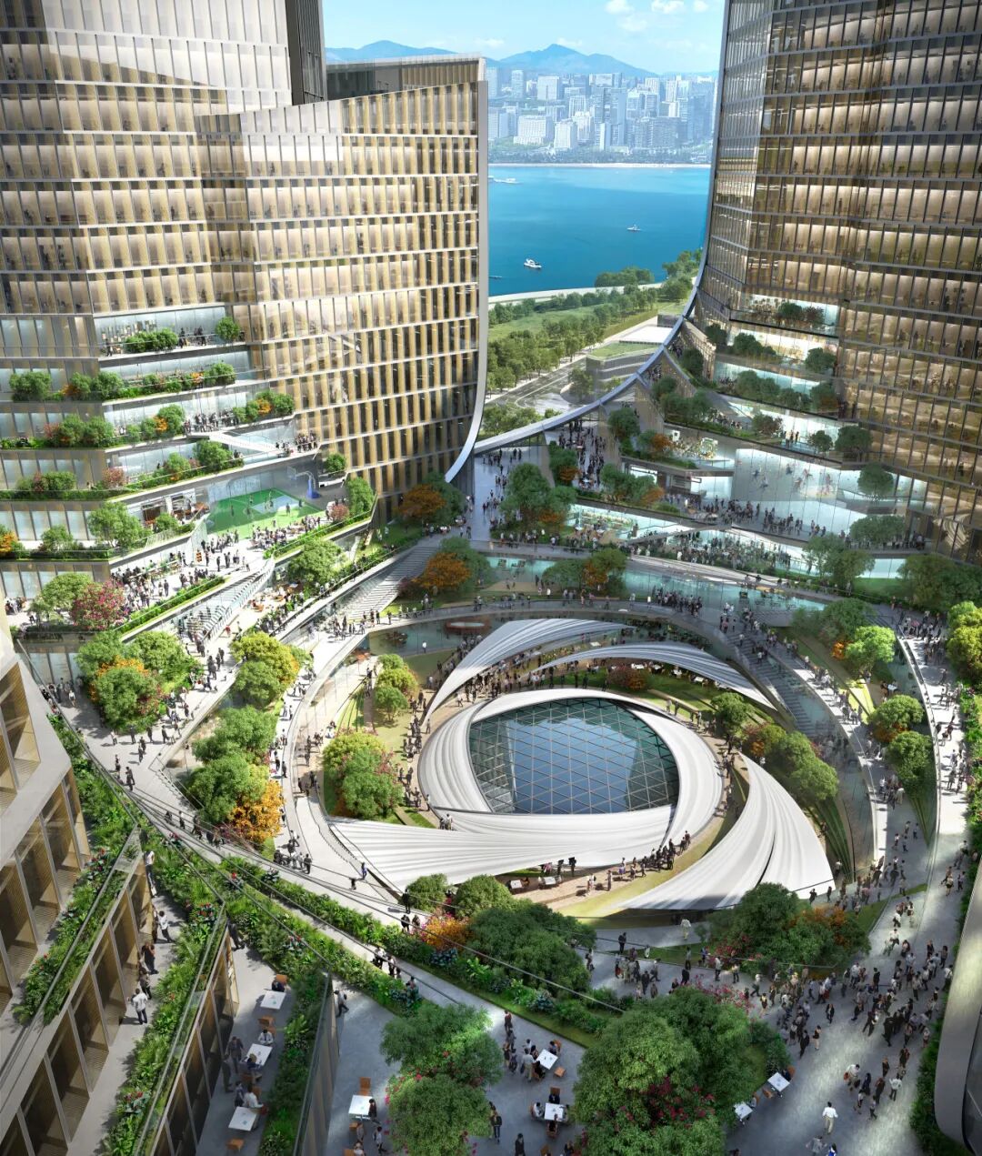 总部的四座塔楼优先考虑被动设计原则,其朝向最大化所有办公楼层的自然采光并允许自然通风。优化的间距和朝向为“漩动花园”(Vortex Garden)创造了遮阳效果,这在深圳炎热且阳光充足的气候中至关重要,同时也作为海风加速器,产生额外冷却效果。其花园生态系统进一步为总部散热,并在海绵城市中蓄水,其水体作为风雨的蓄水池,可用于景观灌溉。