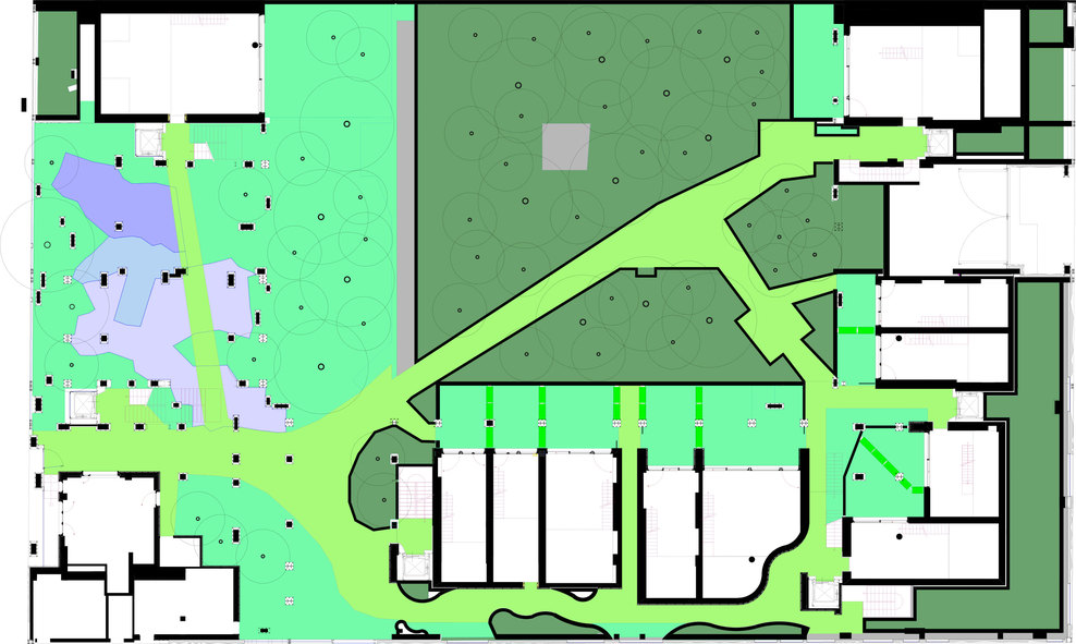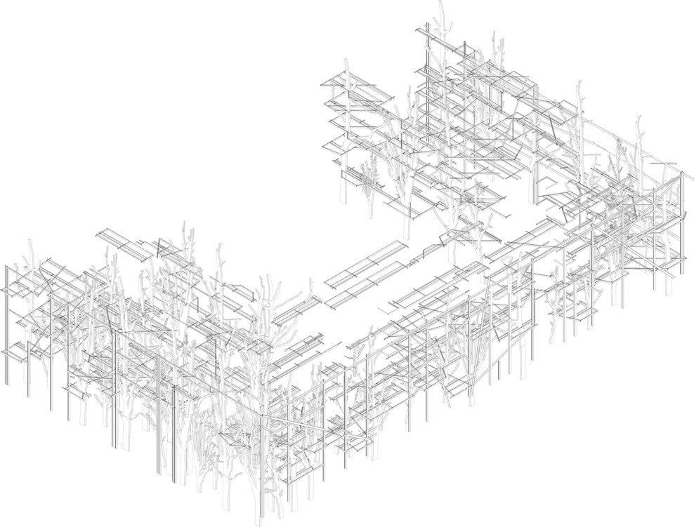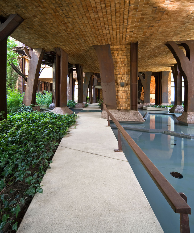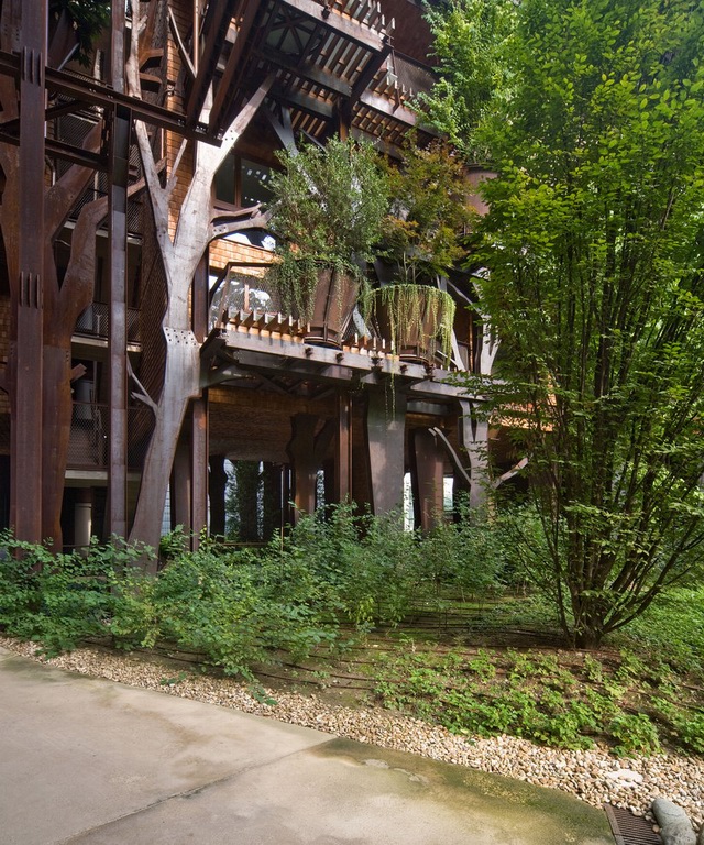 这座位于都灵的集合住宅——25 Verde 仿佛和当时的想法非常接近。设计来自意大利Luciano Pia工作室,25 Verde 由锈蚀的钢铁作为起结构骨架,150棵树木穿插在骨架中类似大花盆的固定位置,水体穿插于步行道间,屋顶设有郁郁葱葱的花园。整座建筑犹如一座现代城市中的机械森林,它是可呼吸的,并会随着时间的变迁呈现出不同的样貌。建筑中的植物成为调节内部微环境的关键,可以有效地屏蔽城市的噪音与烟尘。