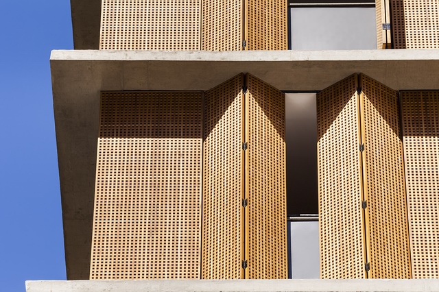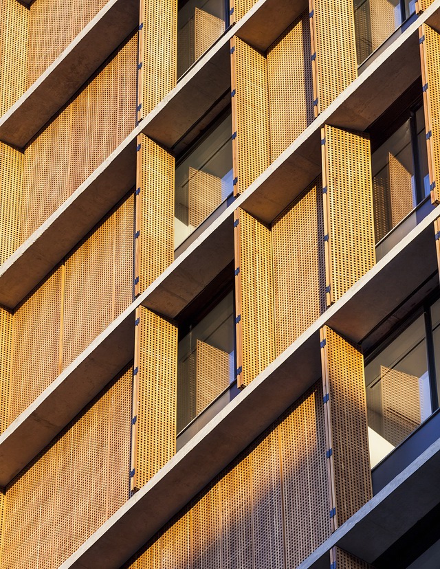 建筑在两个主要朝向上采用了一种穿孔木板作为外墙材料,同时作为可任意开启的窗扇,用户可根据自身需要在不同时间开启不同位置的建筑外墙。于是产生了一个神奇的视觉效果,建筑的立面可能是随时变化的,窗子时有时无。