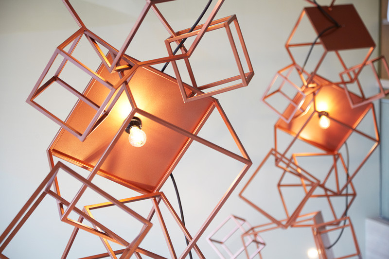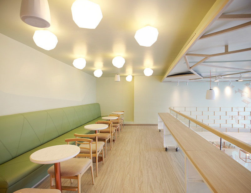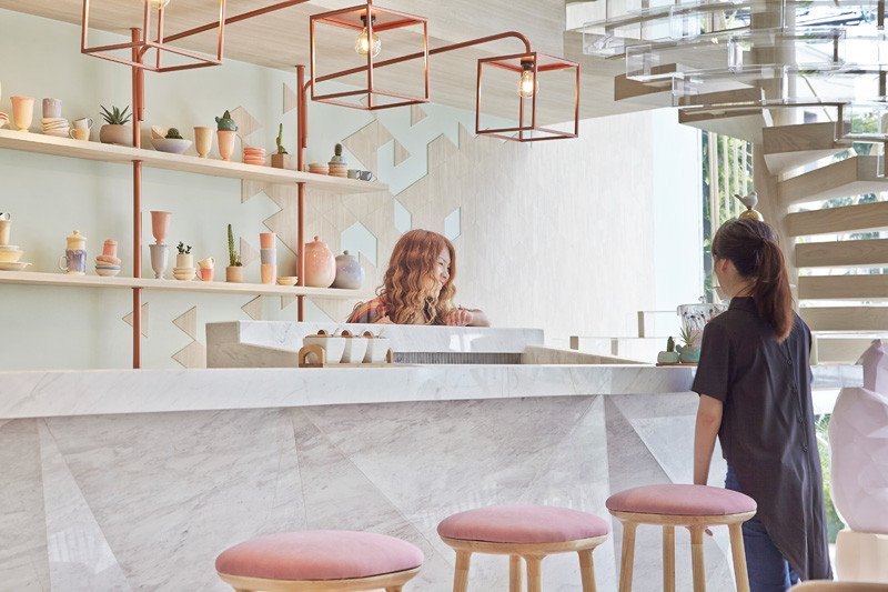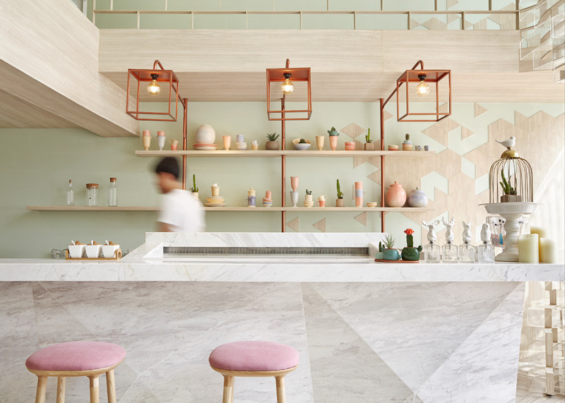 餐厅的设计灵感来自糖晶体(sugar crystal),所有我们进入餐厅内部后能够感受到明显的晶莹剔透与几何轮廓。整个空间的色彩非常柔和,木材与玫瑰金金属在这里大量使用。