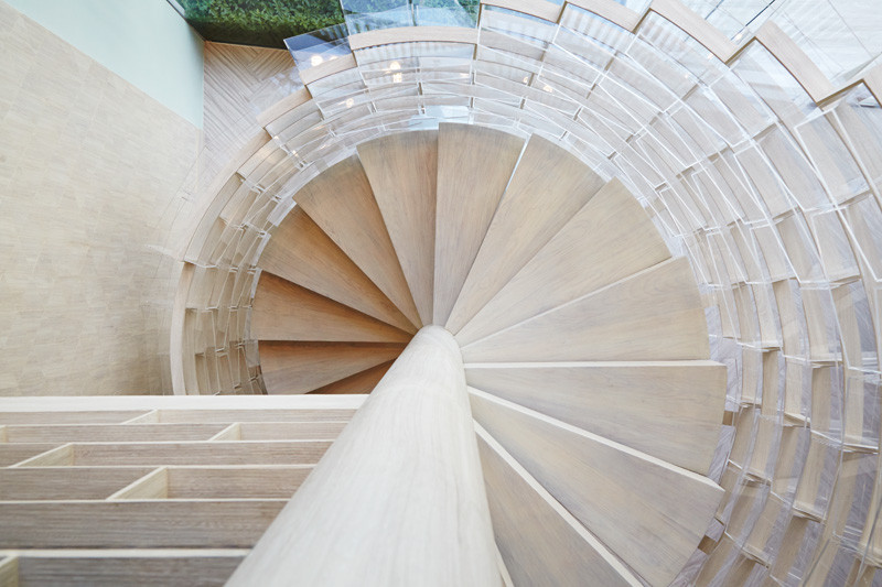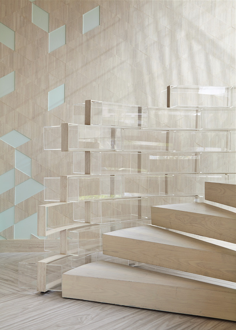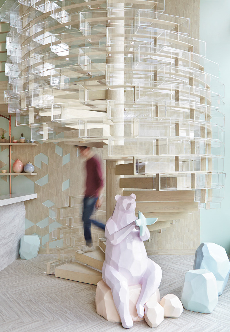 为了突出主题,墙壁与天花板做出了立体的凹凸几何造型,照明的灯具也被方块框住,让人联想到一块块的方糖。SHUGAA餐厅最惹眼的要数联系一二层的旋转楼梯,亚克力方砖堆砌起来的楼梯挡墙依旧体现着晶体、透明的理念。