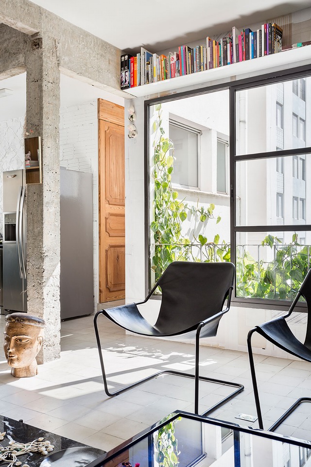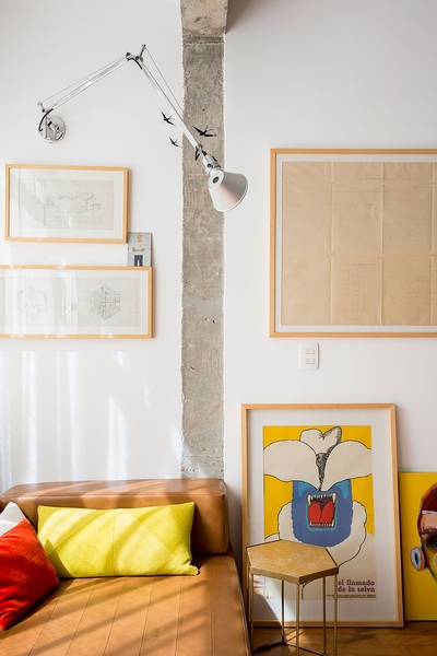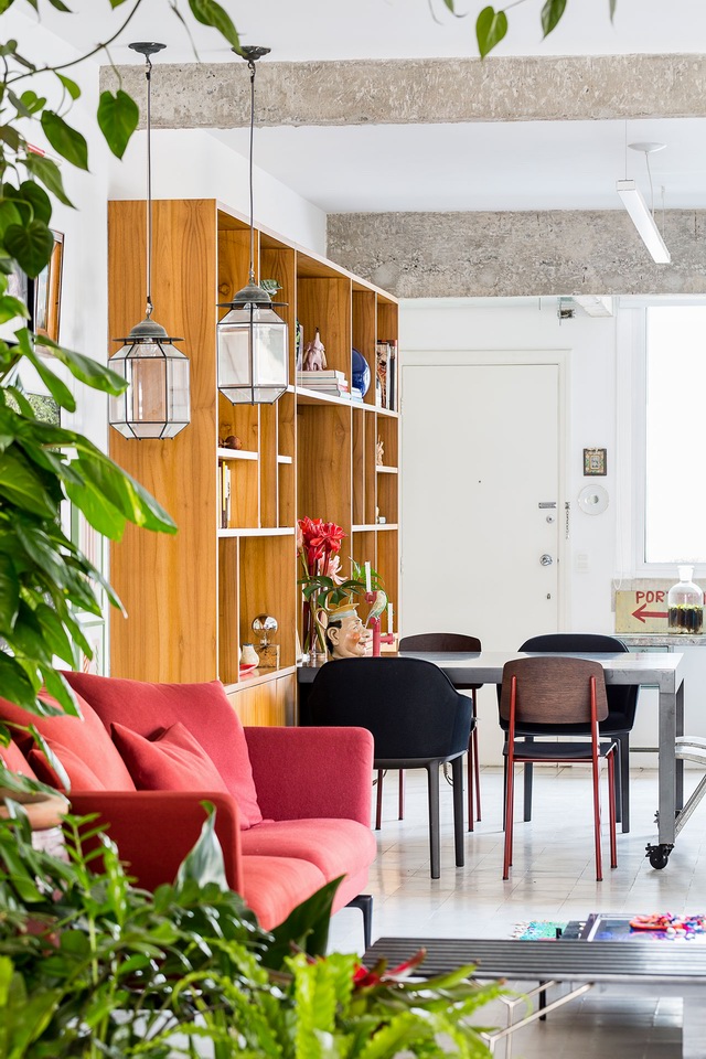 起居室与工作区之间被许多各类型的植物隔开,让工作区变得相对私密。这些植物的设计选择专门请了景观艺术家Daniela Ruiz,在谈到这些植物时,主人讲到:“我们生活在一个特别灰色的城市,公寓又变得越来越小。植物是非常美的,它们让房子生机勃勃,让我们与自然连通……”
