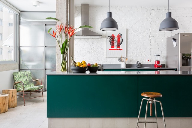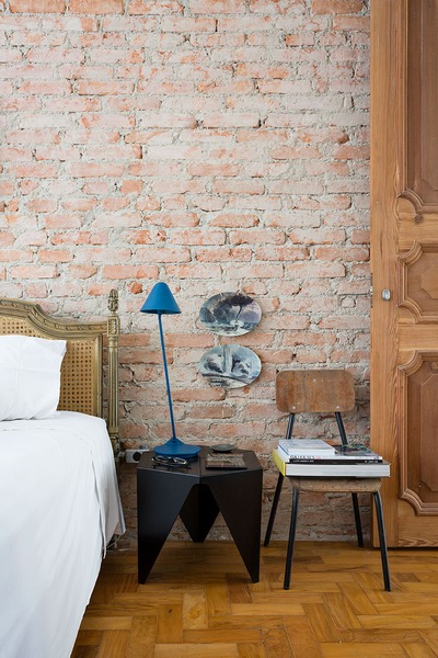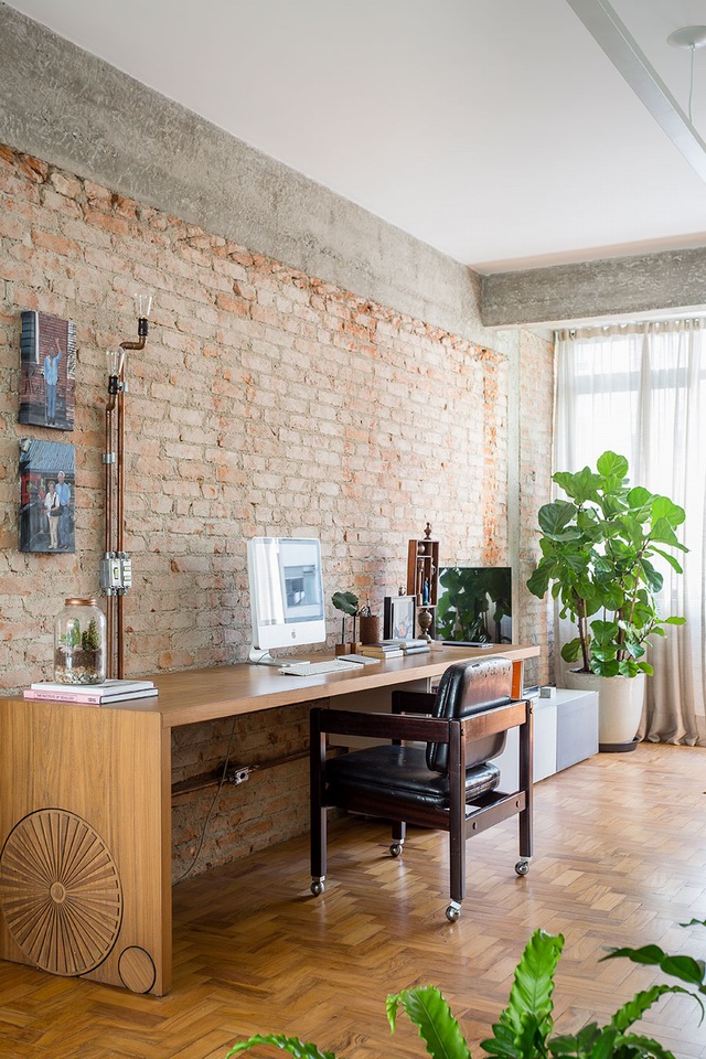屋顶的混凝土过梁以及卧室的裸露红砖墙增添了些许残缺美及历史痕迹,显得很随意。关于那面红墙的产生,其实还有些偶然因素:“本来,那里是面白墙,一天想要在床头用双面胶挂上一幅画,可竟然将墙皮粘了下来,露出了里面的红砖,发现原来红砖更加吸引人,何不干脆把强铲了”RSRG Architects的设计师Rogério Gurgel 回忆到,他对这一做法相当满意,据说他与该公寓的业主同居于此……(这~~)
