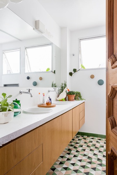 从当地 Embu das Artes 古董市场淘换来的复古门将原来的门替换掉。其中一面墙壁换上了艺术家 Lucas Simões创作的白色拼贴画,同时由于原来的木地板布满了被白蚁迫害过的痕迹,现在被换成了简单的水泥瓦。