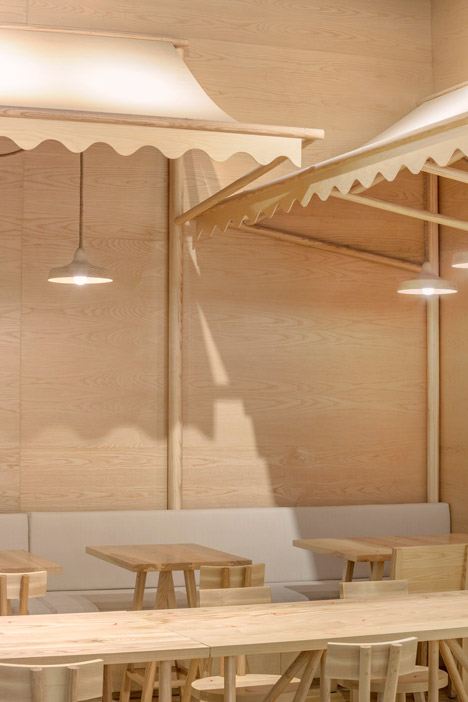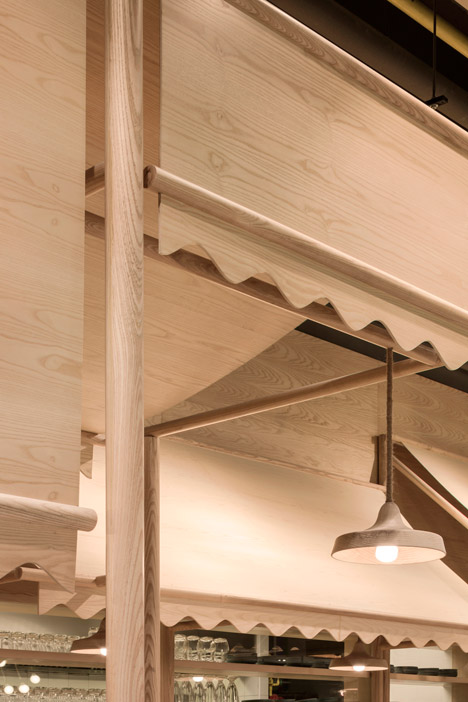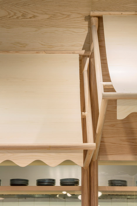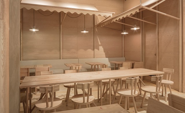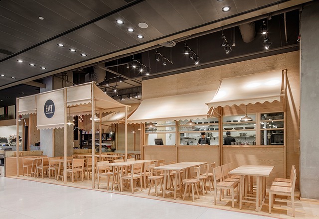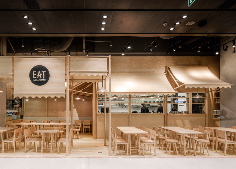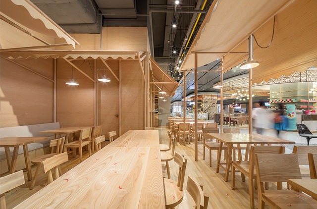 这是一家位于曼谷EmQuartier购物中心地下一层美食广场内的餐厅,名为Eat Rice&Noodles。餐厅模拟了传统路边大排档的风格,整体用木材打造,仿佛是一个木制微缩模型。