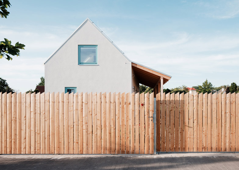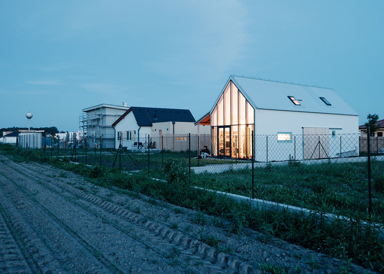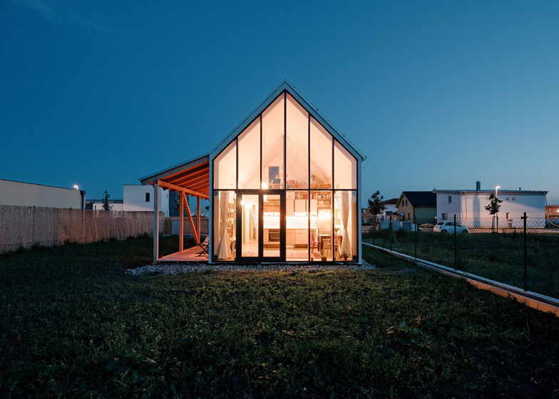 斯洛伐克JRKVC工作室设计了一座位于首都布拉迪斯拉发(Bratislava )附近的小房子,房子的主人是一位单身妈妈和她的女儿,以及女儿的男朋友。小房子共85㎡,北侧山墙全部为玻璃材质,傍晚来临时透出室内温馨的橘色光线~