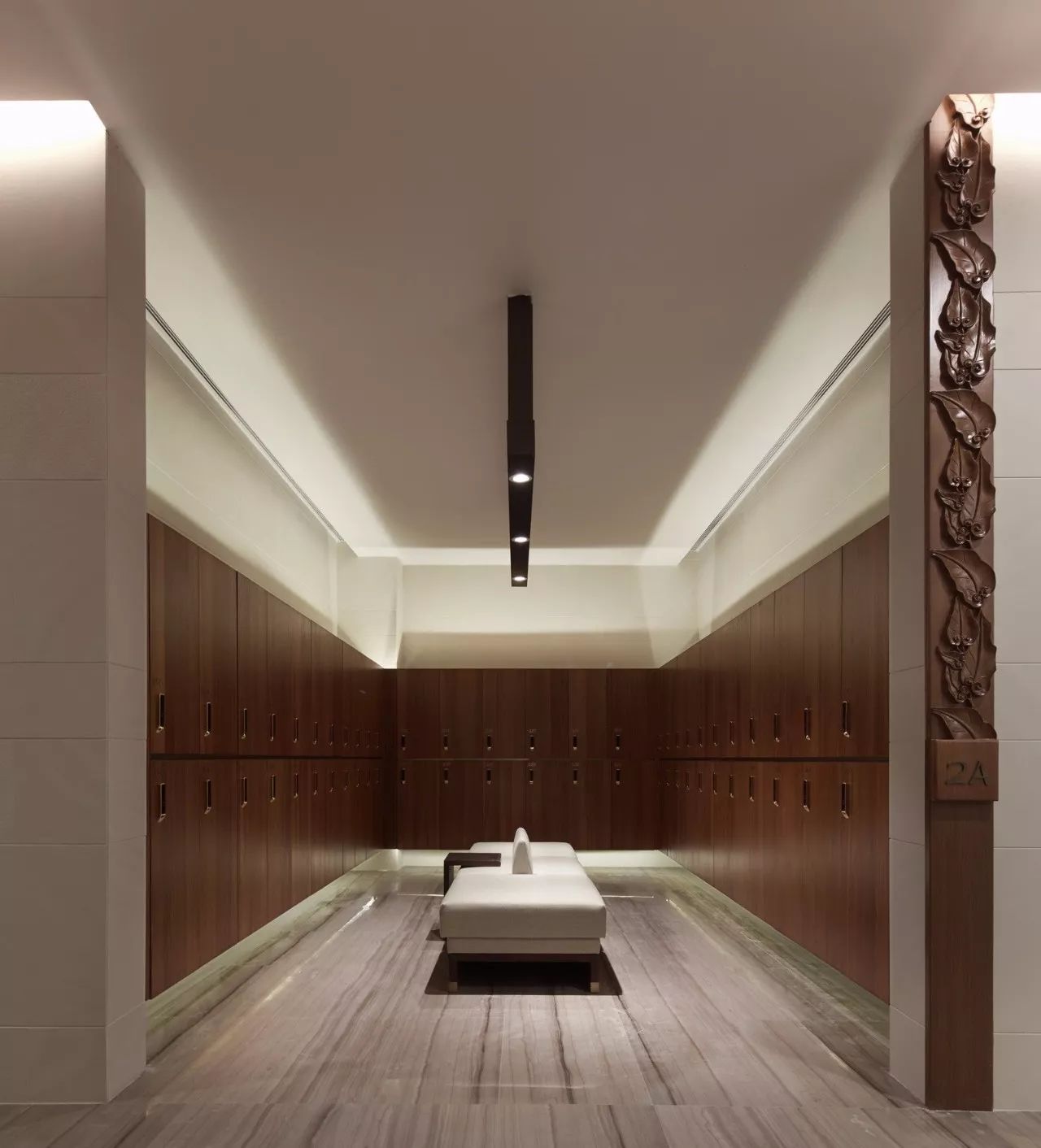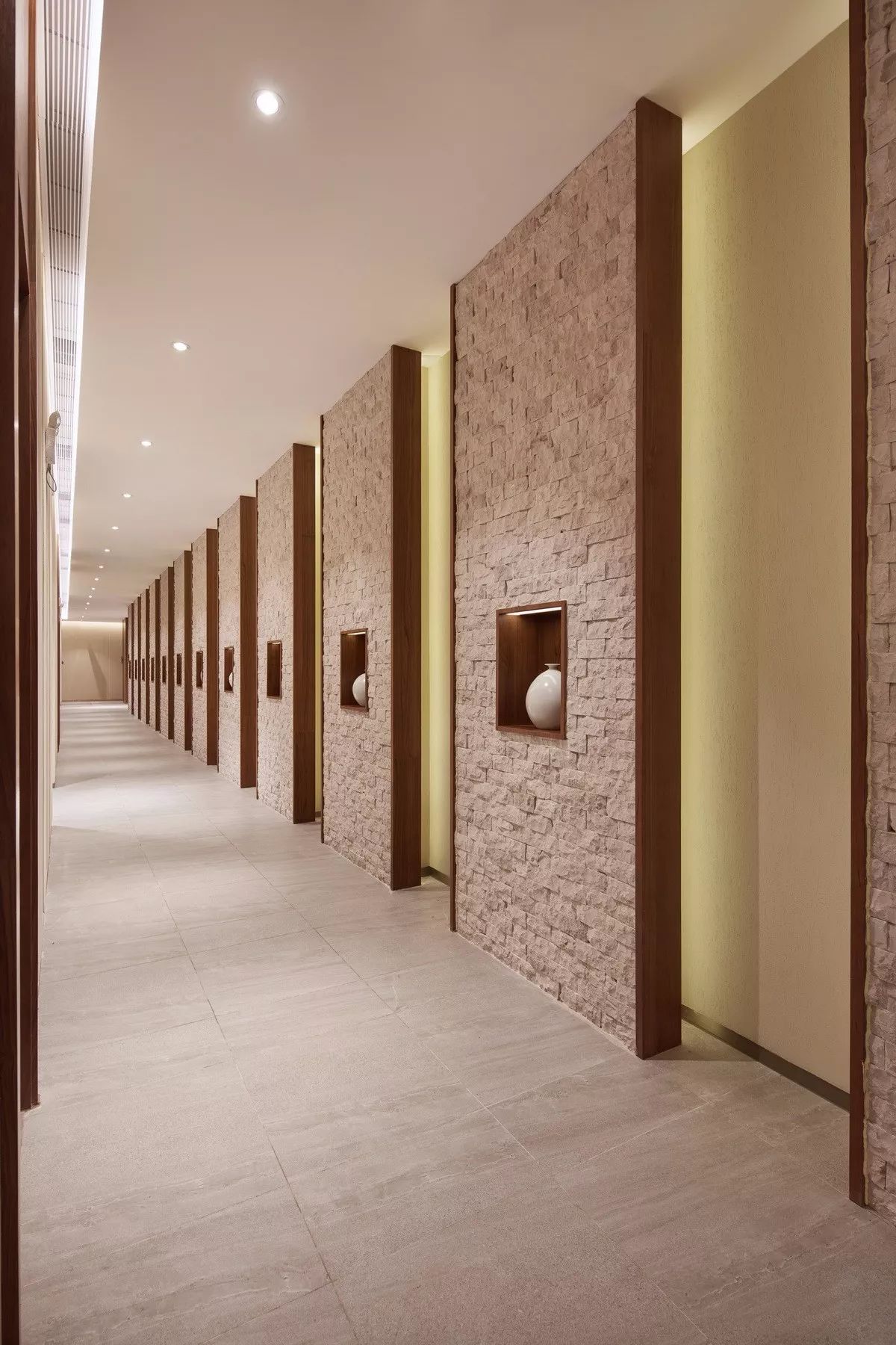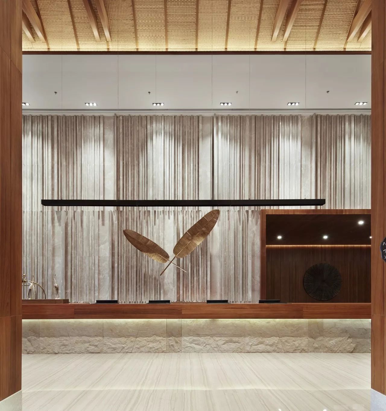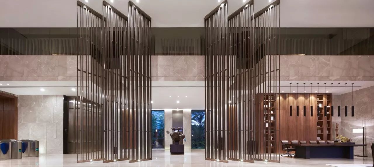 该项目的大堂接近六百平方米,门厅阔度十米,内空一览无余。设计师因此在设计过程中在大堂安排了一个一分为二的莲花池,中间以小桥相衔。用意是将户外的自然物景有机的延伸到室内,同时在莲池两边的垂直面上各增加两条立柱,既为这个巨大的单体空间增加一个可供玩味的细节,又可以丰富空间层次,削弱一下“空”的心理感受。唯一有些遗憾的最终在实施过程中取消了大堂中莲池的设计。