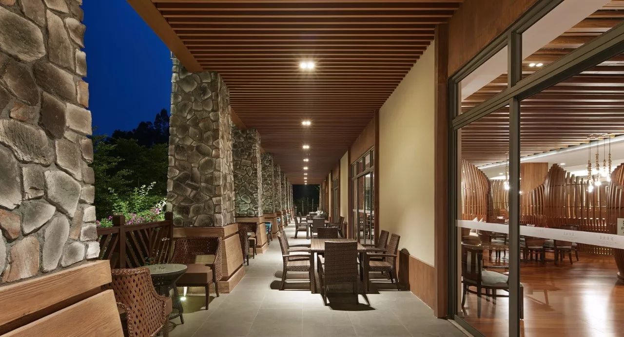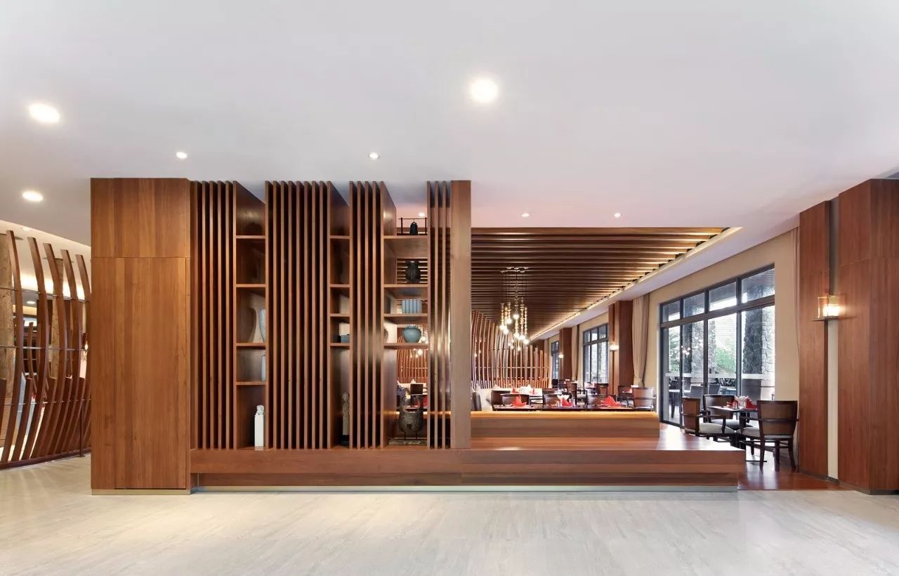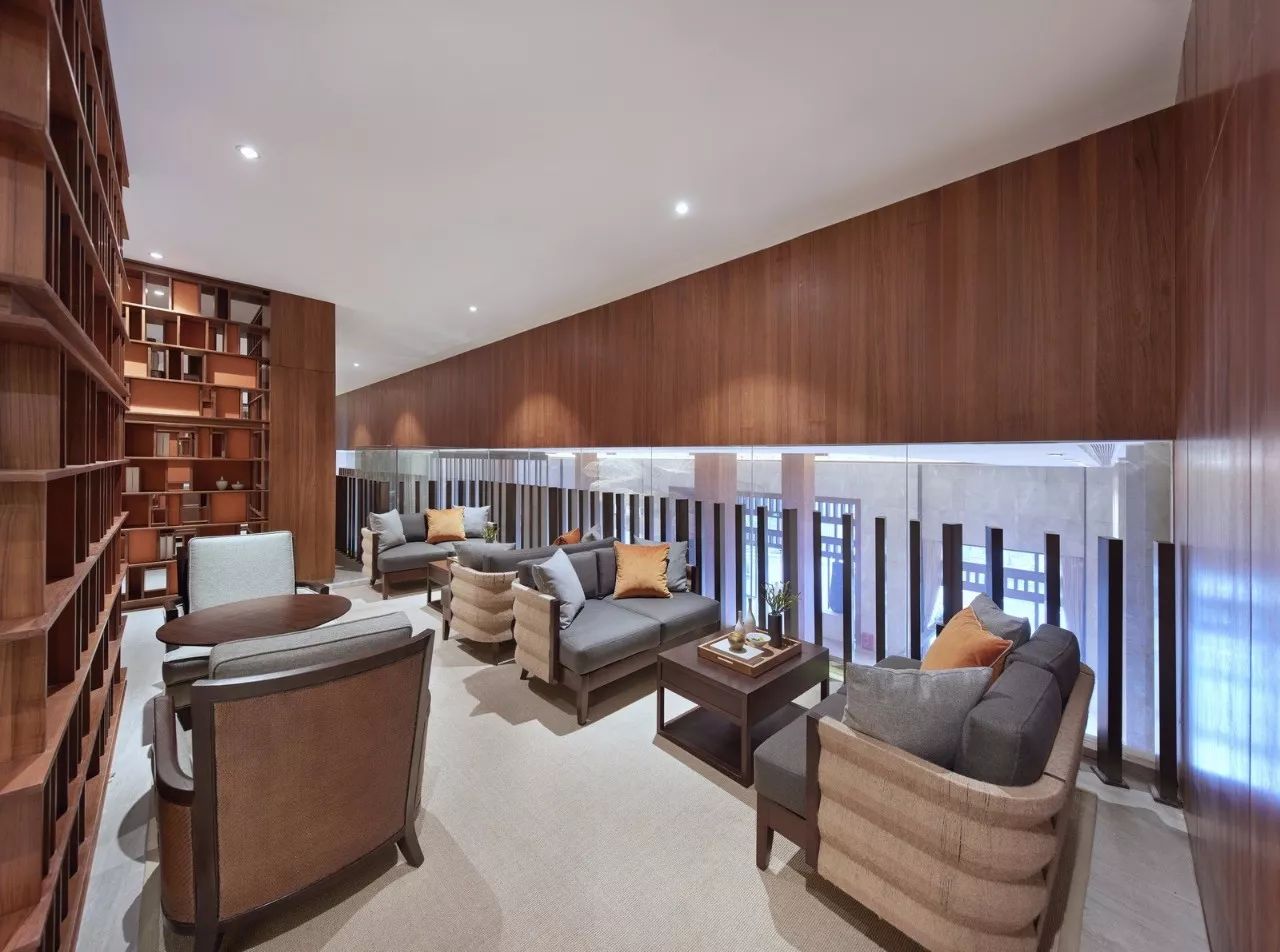 第二步则是团客和散客在大堂办理入住手续后,能迅速进入旁边的更衣室,减轻大堂人声鼎沸的压力。在更衣沐浴后,或者进入园林式户外温泉区,或者直接上二楼休息区。在二层休息区,设计师则将SPA区、休息区与餐饮、棋牌、阅读、儿童区先作大的功能分割,将健身房、球类活动室用玻璃作完全隔音的封闭式处理,以书吧作为几个功能区的半遮断式衔接,起到进一步消音的作用。这一部分,尤其应该首先关照休息等候区的客人,不能受噪音影响,只有人声隐约的同时,却不致扰人清静。譬如“鸟鸣林更幽”。