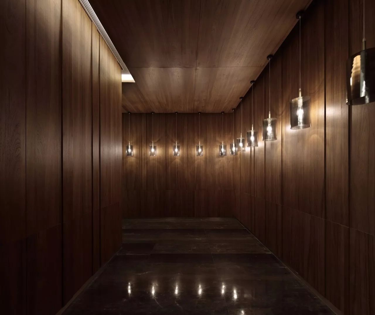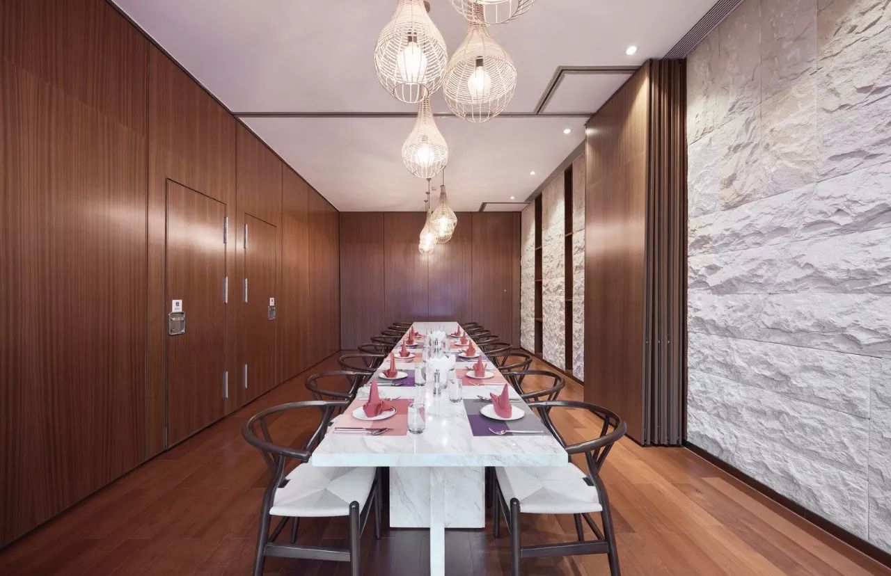 从大堂VIP的专属通道,乘坐电梯到达三层后,便是一片户外的水景,通过一道木廊再进入室内。设计师利用“水”这一概念,在由视觉形成的的感受部分,将空间由外到内,再延至屋外,营造了一个体感空间,并赋予其音乐般的节奏。