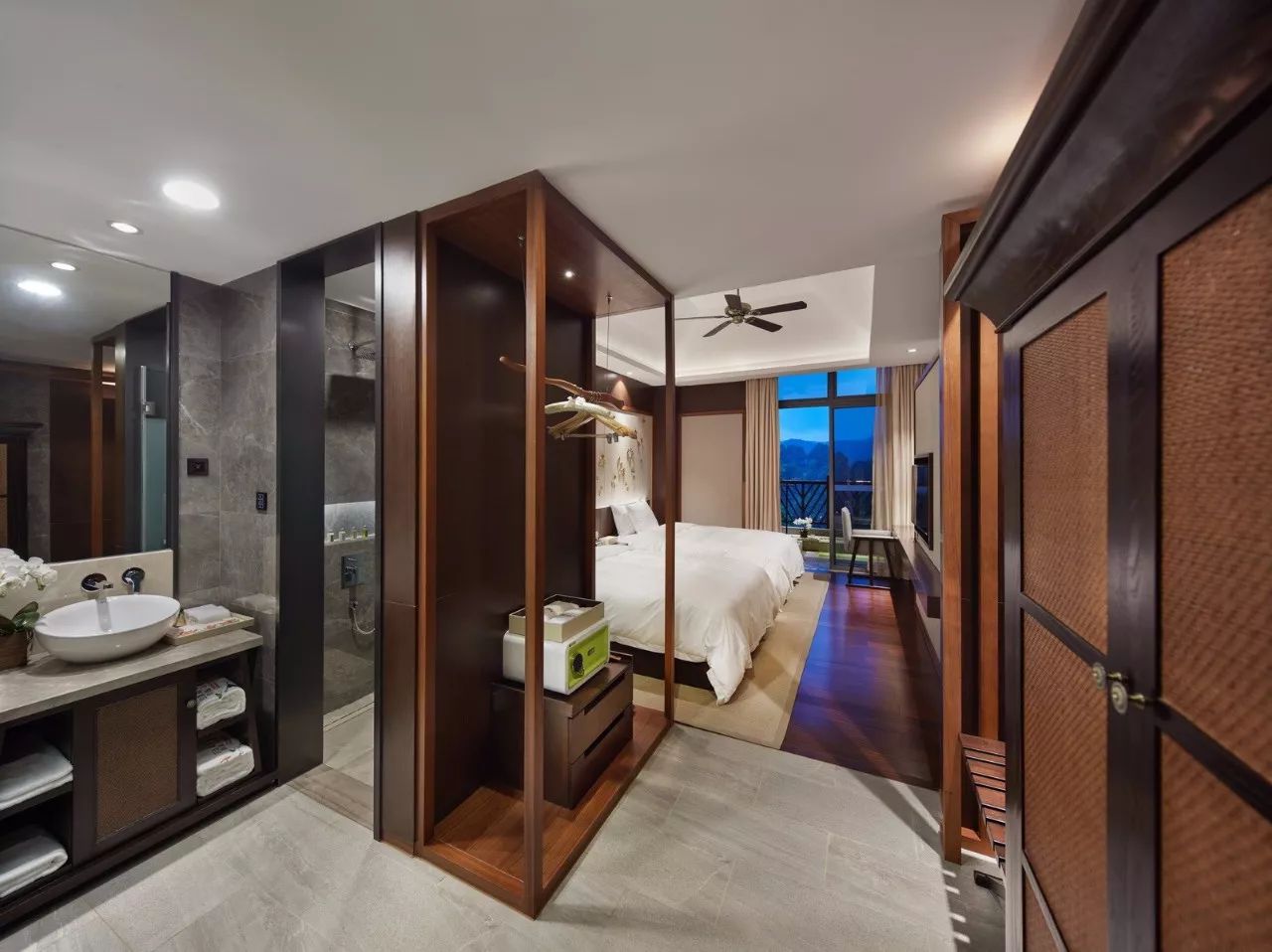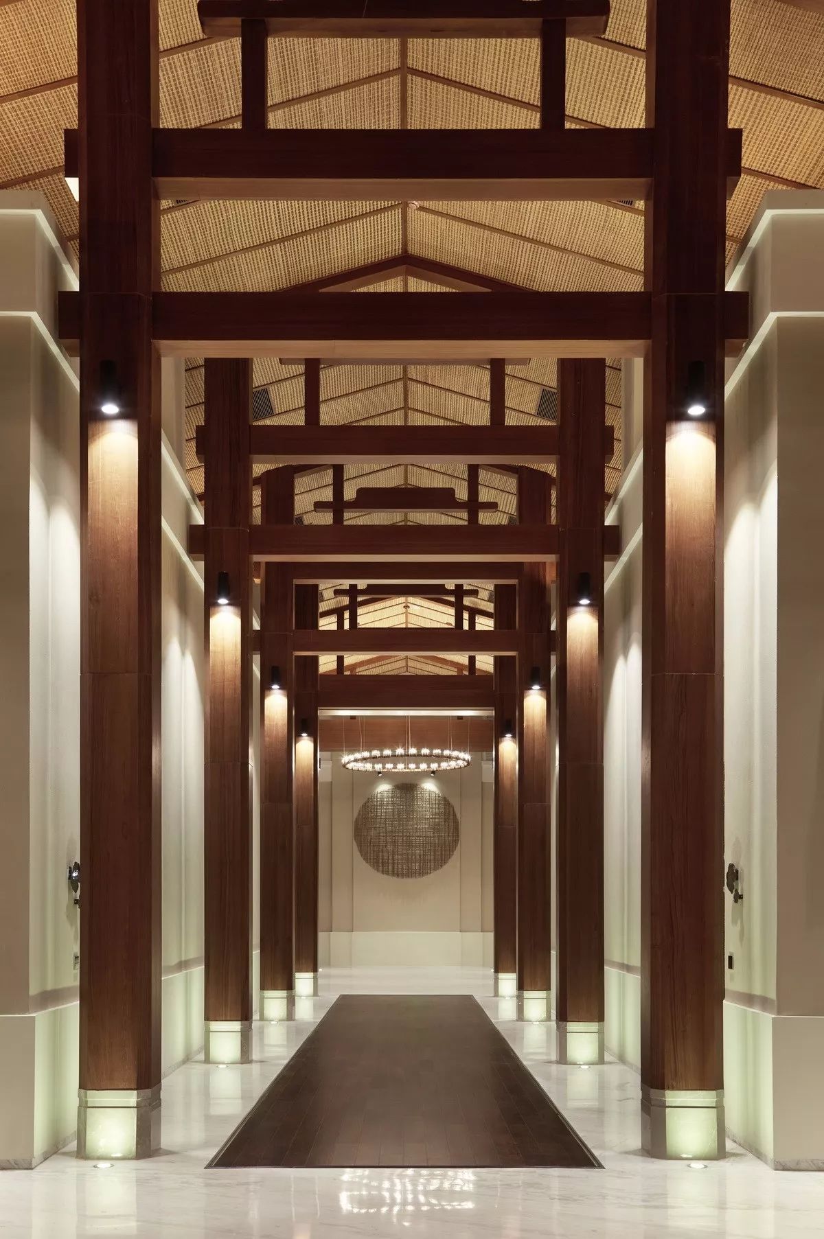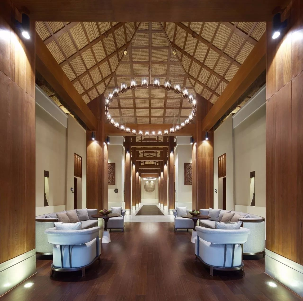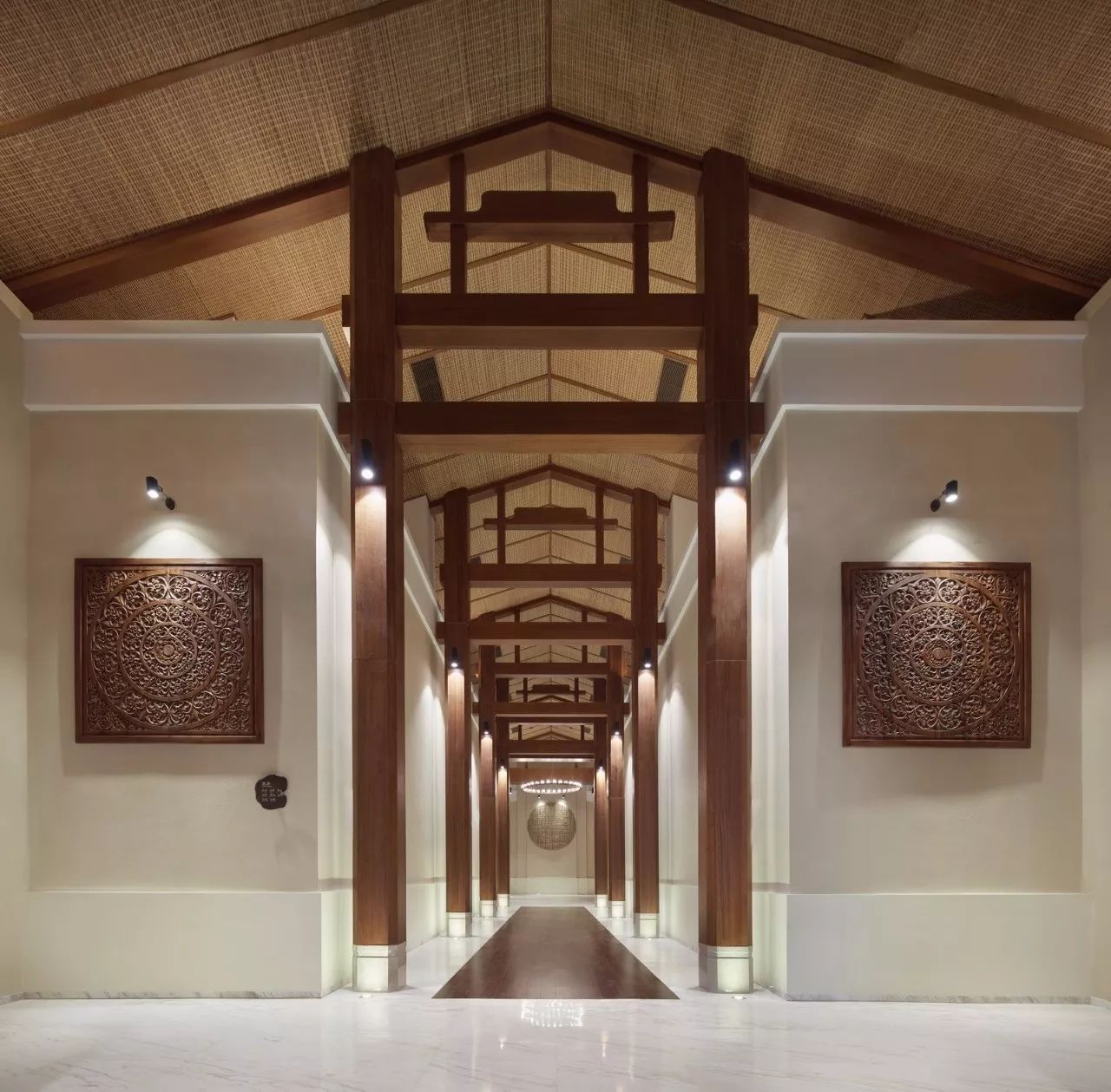 在设计过程中,设计师不扮演考据学者的角色,并不拘泥于所谓的元素,而是取法“运用之妙,存乎一心”,表达全球化状态下的在地设计,在空间的层面,它只要求有东方的印象,却不执着于东方的某一特定地域特色;在材质、构造和色调上,只有抽象意义的东方,无谓其抽取于何处。而到处理人可以触及的部分,设计师则将装饰、艺术品具体化,将现代的和带有明显地域色彩的艺术品结合在一起,将现代作品和东南亚的传统雕塑,纯东亚风格的装饰品进行混搭,营造一个由虚入实,由抽象到具象,由可观到可供玩味的空间环境。