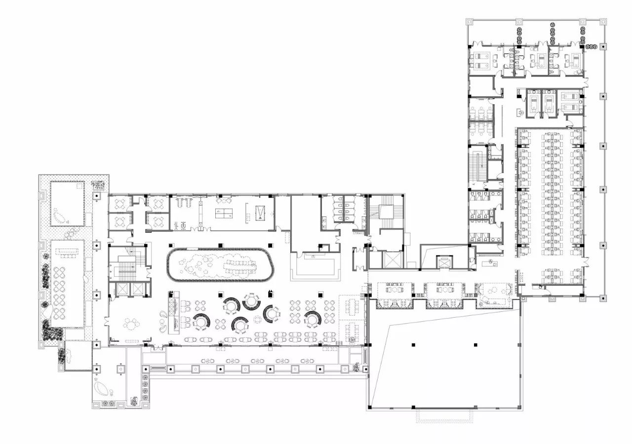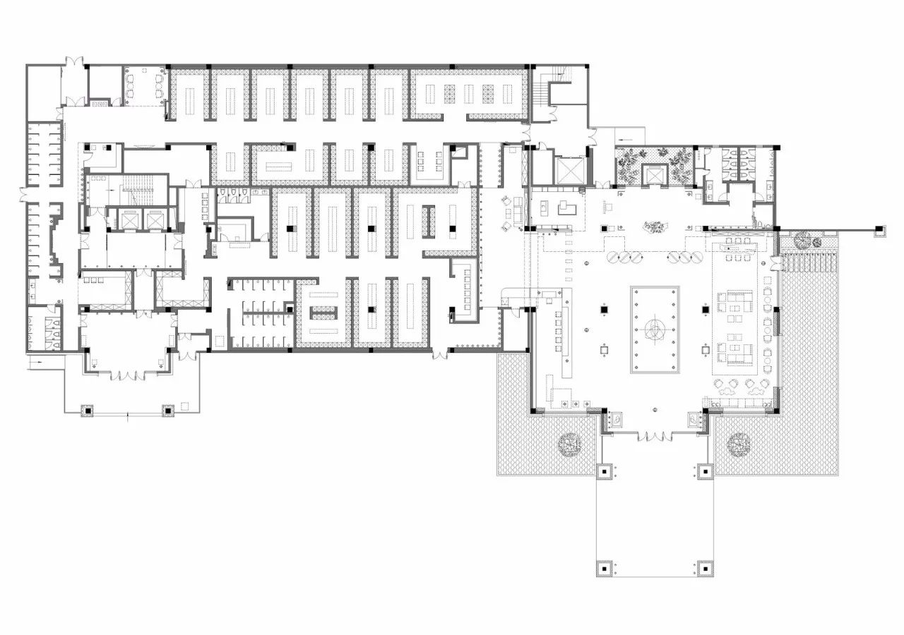 一个大型的公众场所,在功能分区的层面,将人员合理分流是设计中最要紧的部分。几千平米的商业休闲空间,意味着相应众多的人群。要将这些人群各有区处,不至产生喧嚣嘈杂,对于设计师而言,在平面上解决这个问题后,才谈得上空间的舒适性,也才谈得上设计的合理。便是譬如引水,须导之有向,聚不漫漶。