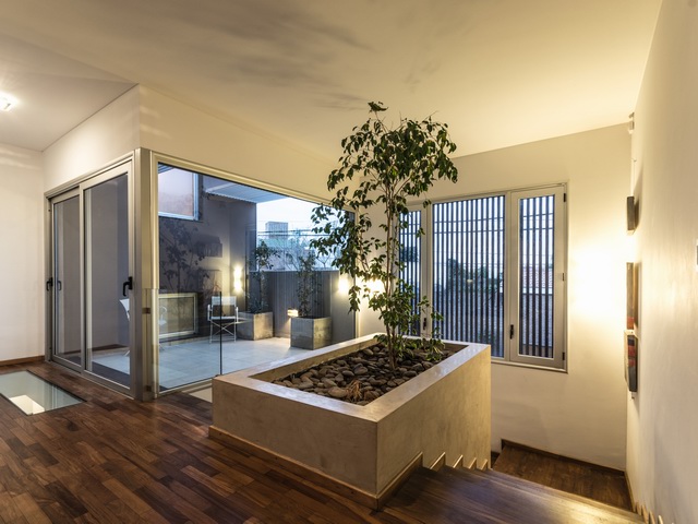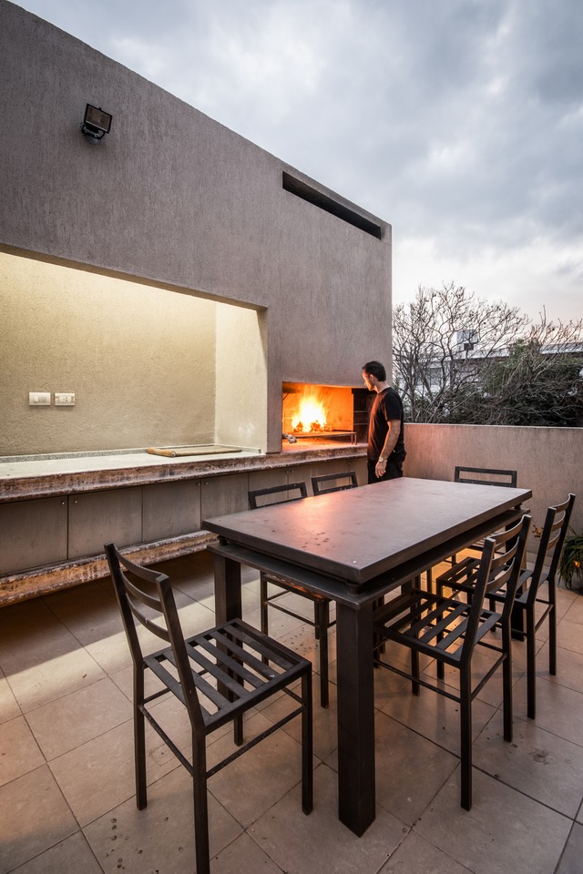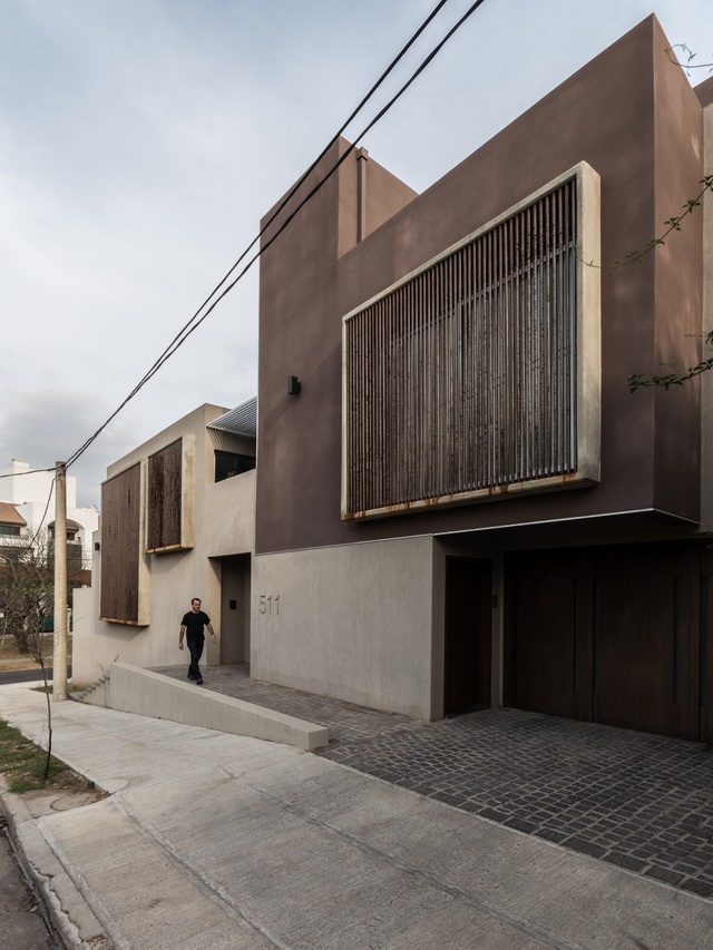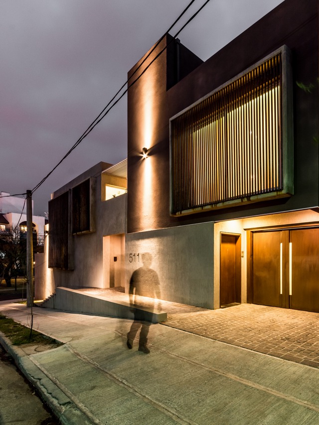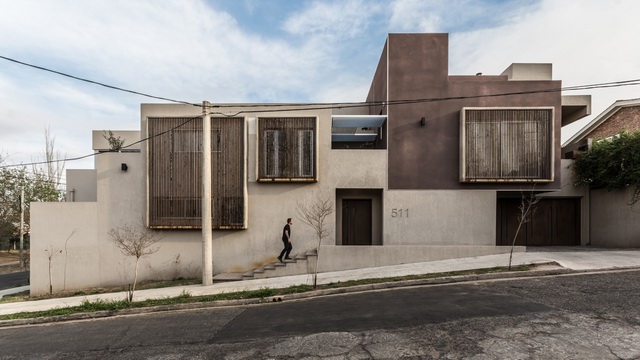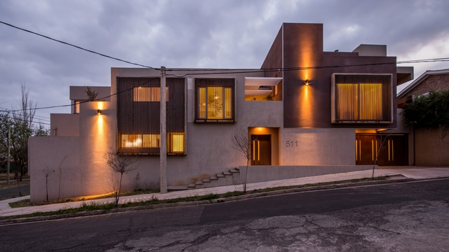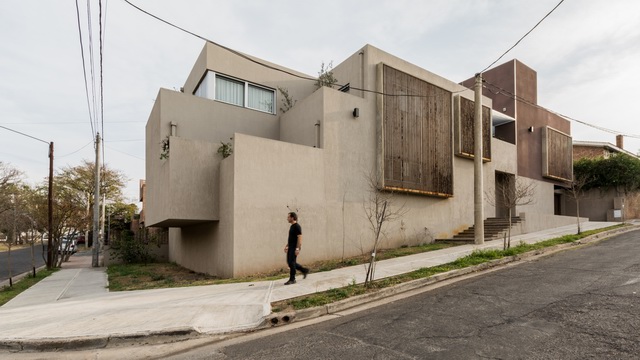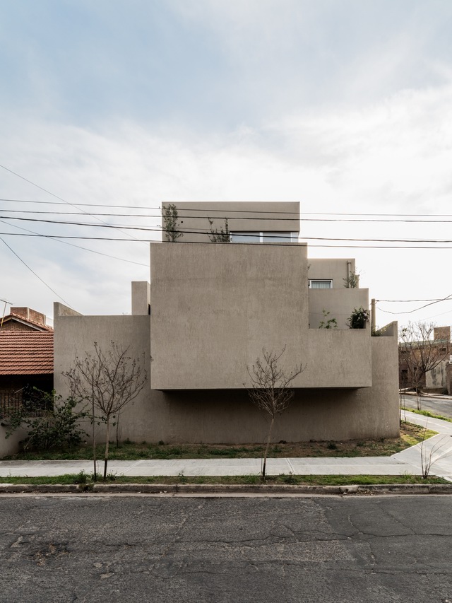 该住宅处在一街角位置,由建筑师Tomás Bettolli设计。建筑沿道路有着不小的坡度,住宅体量很大。错落的相互咬合的空间让建筑立面显得很有平面构成感。同时由于高差产生的错落,在住宅顶部形成了许多大小不一的室外露台,为看上去冰冷的混凝土盒子平添了许多趣味。