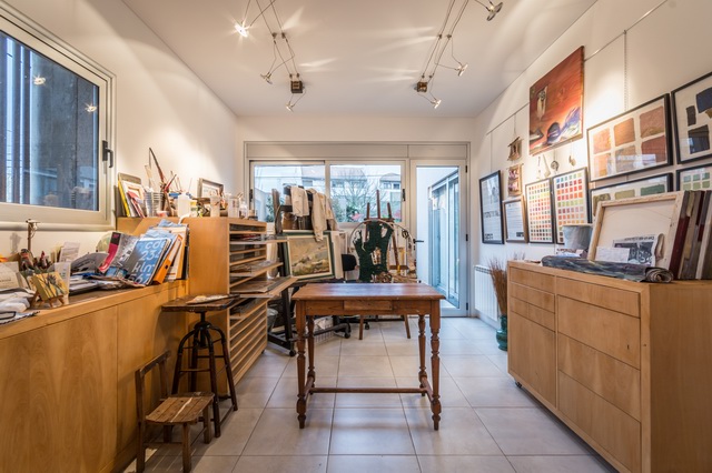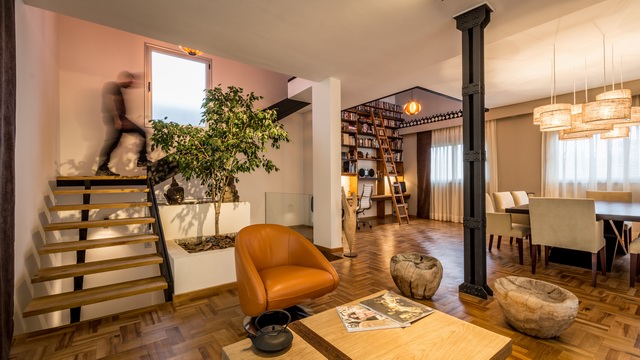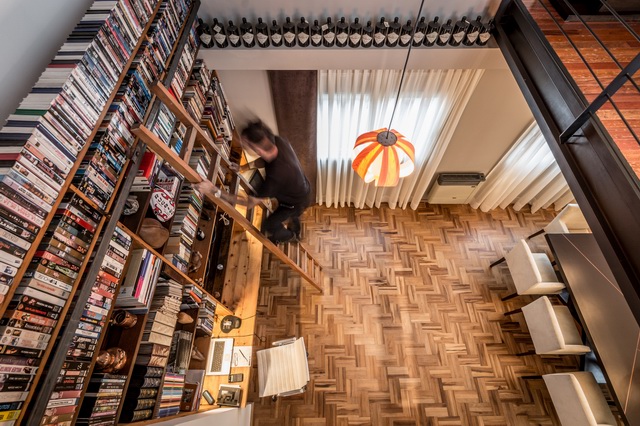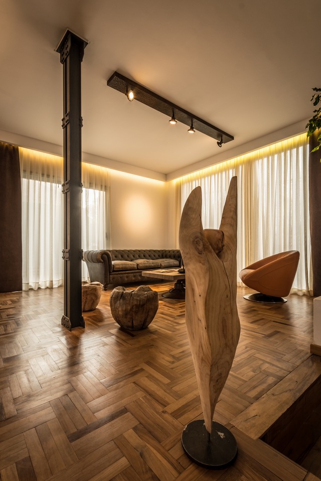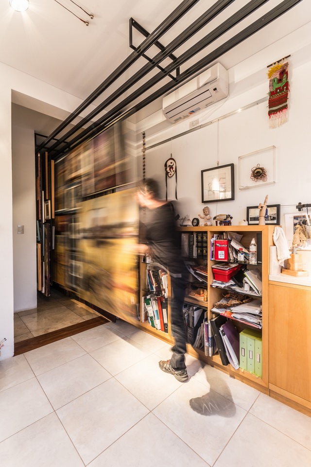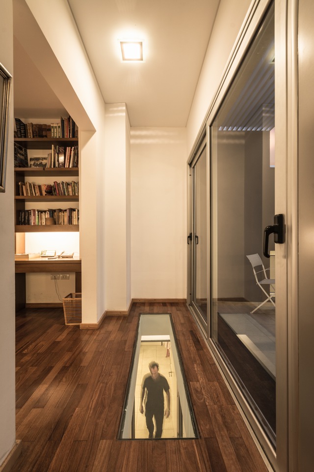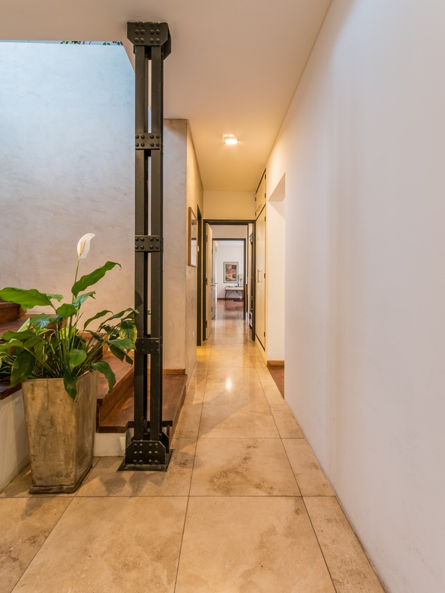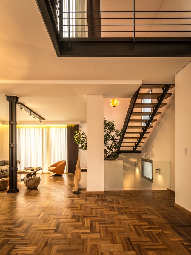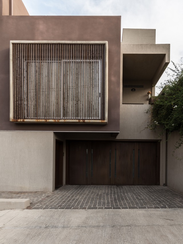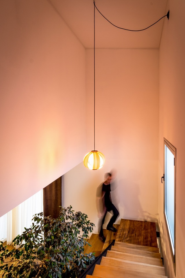 沿街面的窗子上由金属竖条构成的窗幕是为了调节光线而设的,相信也能起到很好的防贼效果吧。同时粗糙锈蚀的金属质感与混凝土墙面很有默契感,让住宅整体显得具有明显的粗野主义特征,很好地表明了主人艺术家的身份。