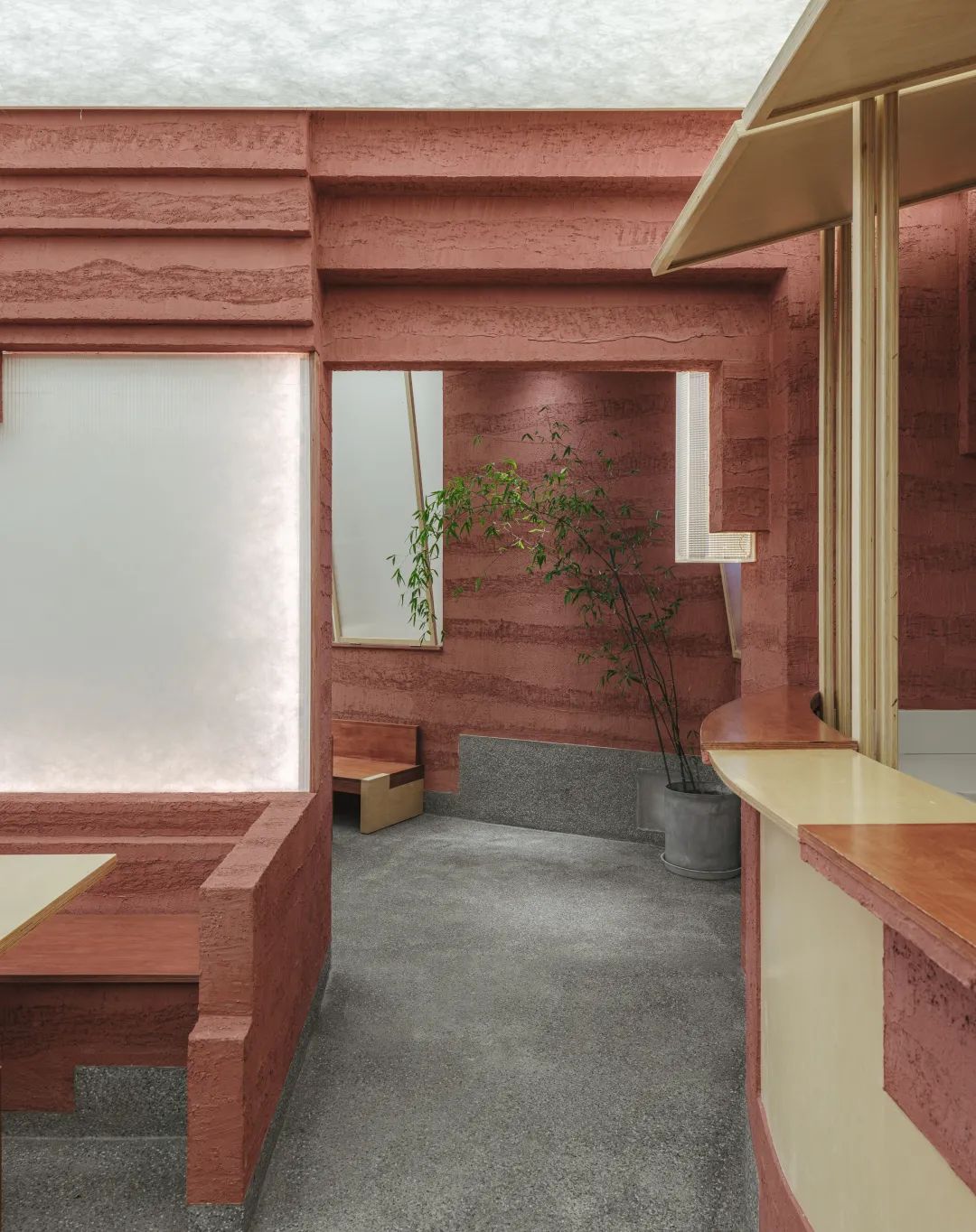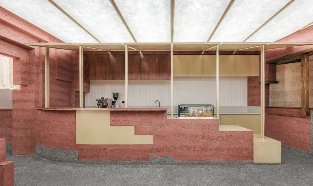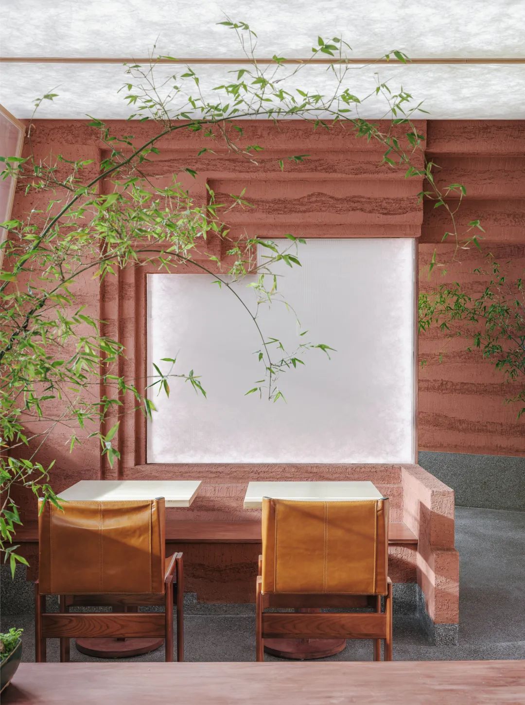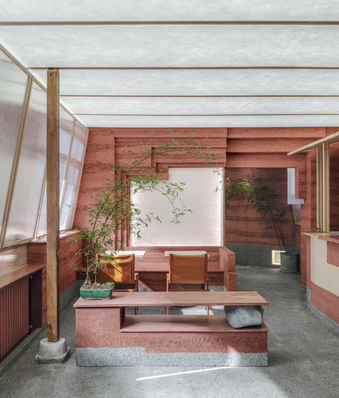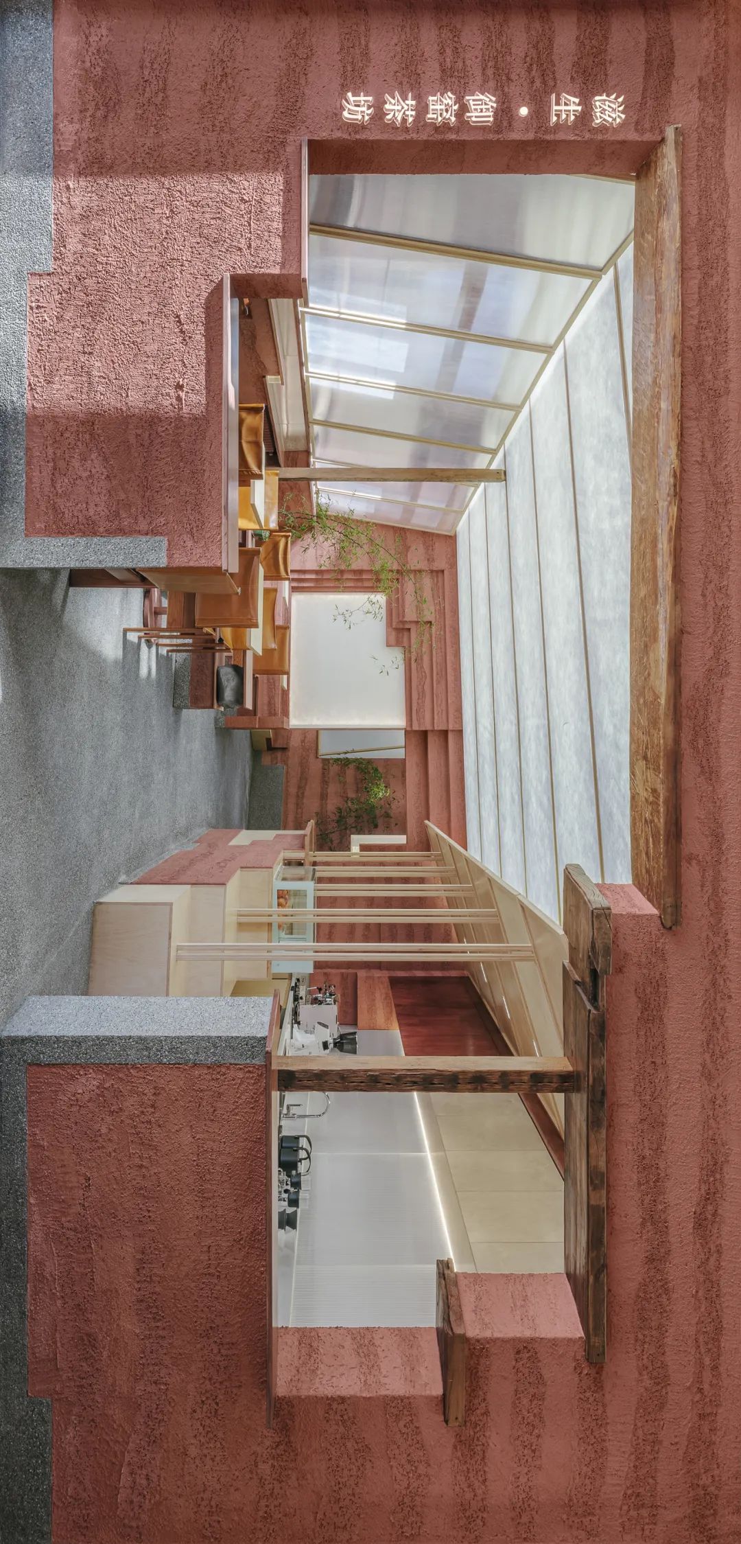 二三年春末之际,我们受景德镇御窑博物院委托,为其设计在北京的展厅以及配套空间。场地在全国农业展览馆的红房子艺术空间内,滋生·御窑茶坊作为展厅的配套茶室,面积不大,五十平米左右,承载着茶饮,文创展卖等功能。