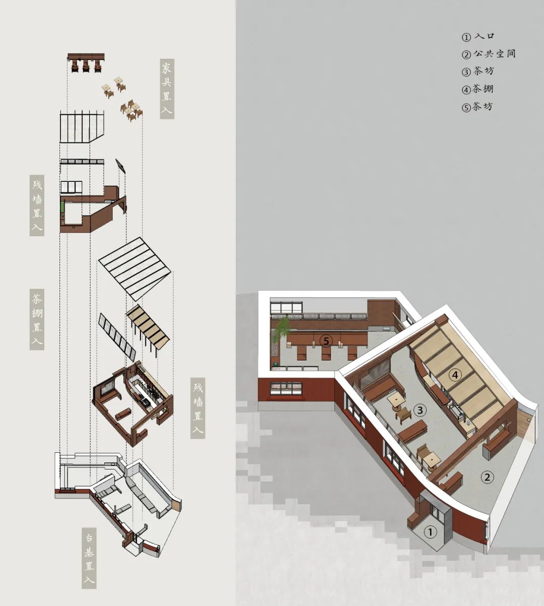 我们通过四层置入完成了院宅废墟上茶棚的情境意向的转化,意在搭建一个在断壁颓垣间临时搭建起的茶棚场景。首先,置入台基,象征着时间的流逝与建筑的遗存。第二层为残墙的置入,复刻原有院宅的残墙,保留坍塌后的结构状态。第三,搭建茶坊操作台和棚顶,形成茶室的必备框架。最后,置入家具,形成完整的品茶空间。