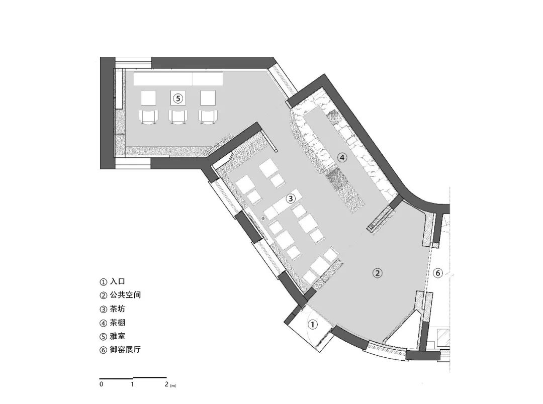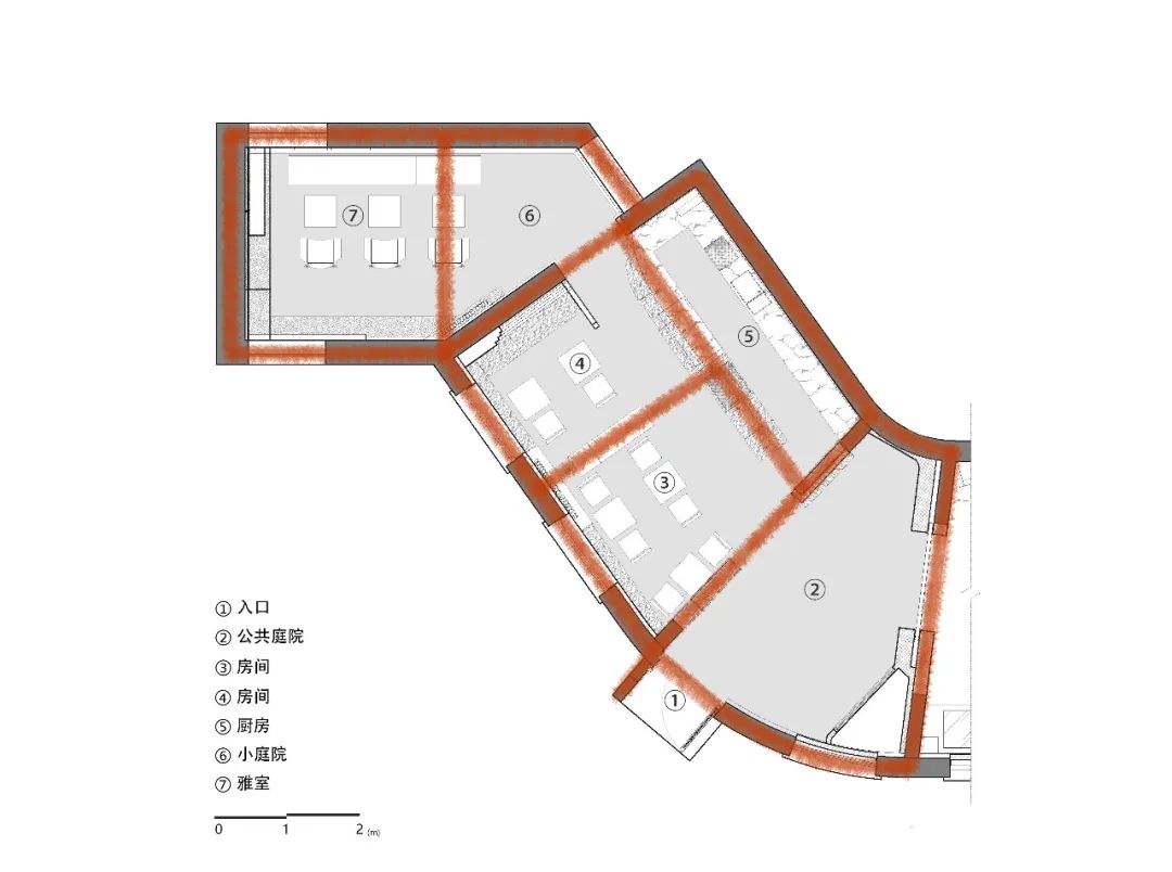 在平面布局上,我们根据原有空间特征,规划出一套融合院宅废墟元素的平面布局。从入户庭院到房间,到厨房,从小庭院到雅室,皆由这套院宅废墟原有的平面生发而成。