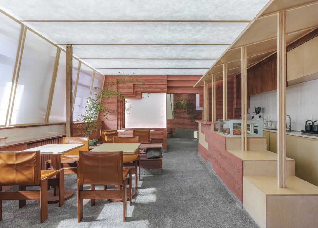 为了捕捉光与影的时间性,我们在茶坊内设计了一个发光顶,模拟临时茶棚的自然光线。可开合的亚克力窗户不仅调节光线,还让微风进入,成为室内的一部分,增强了时间流动的感觉。