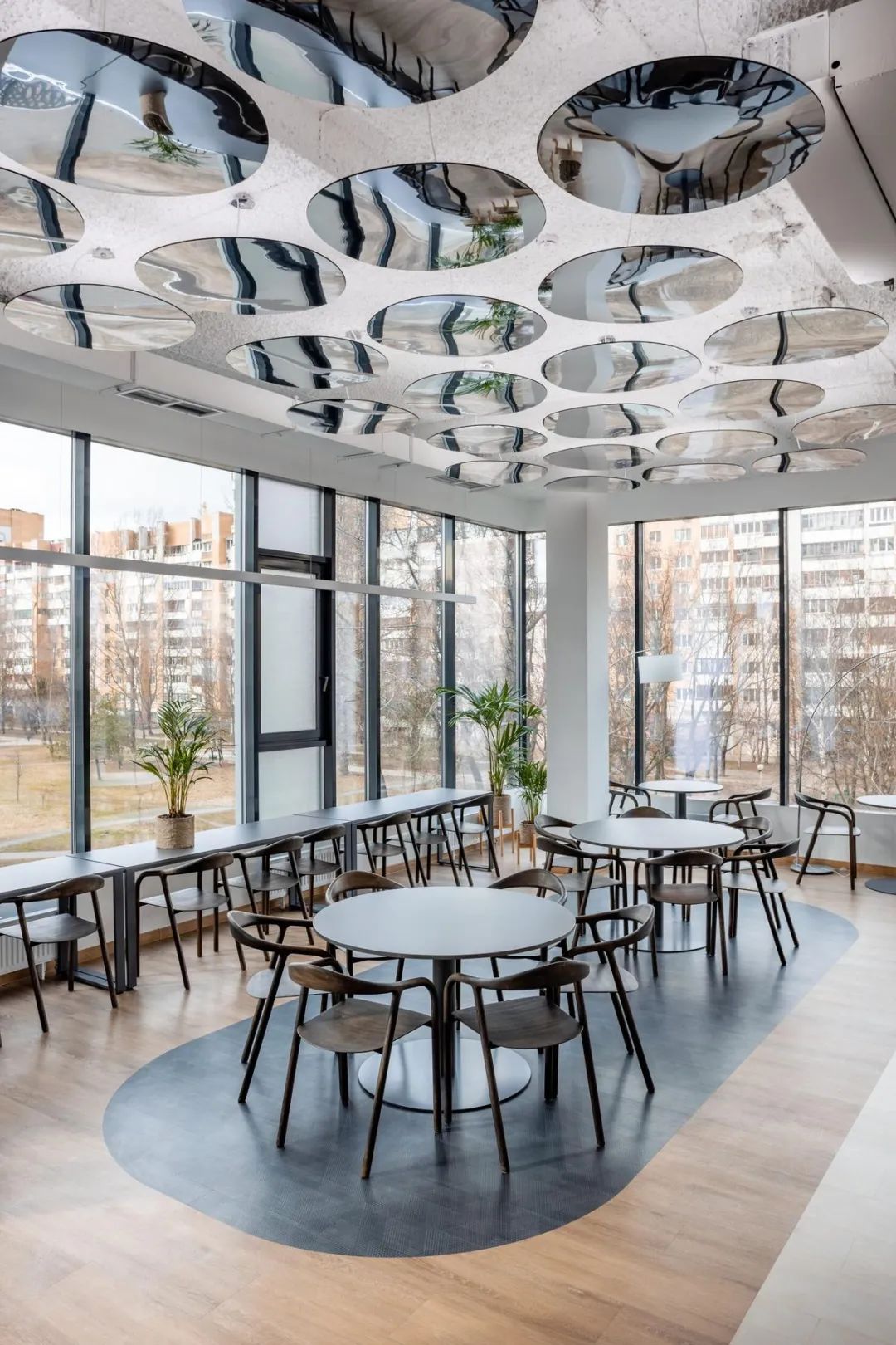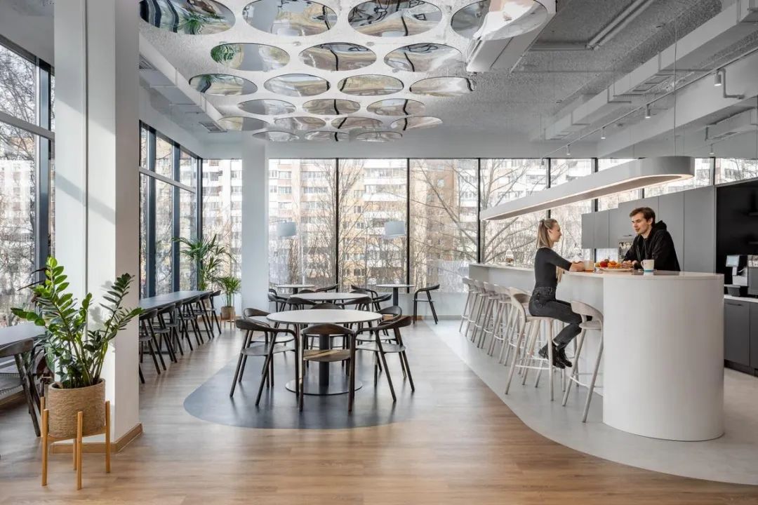 休闲咖啡区位于视野开阔、阳光充足的一角,丰富的座椅类型为员工提供了多种环境,让他们可以聚集在一起进行社交互动。