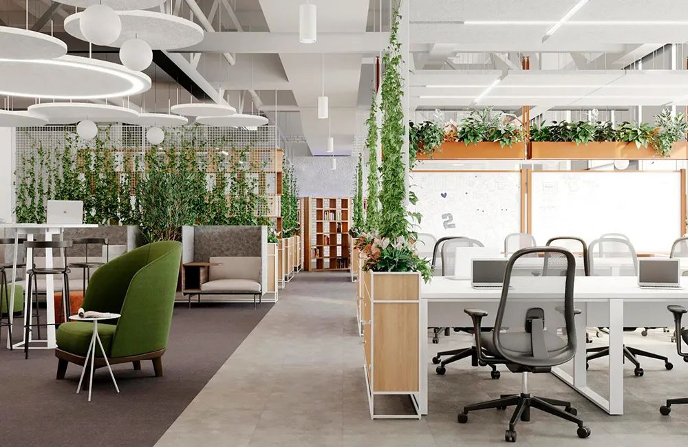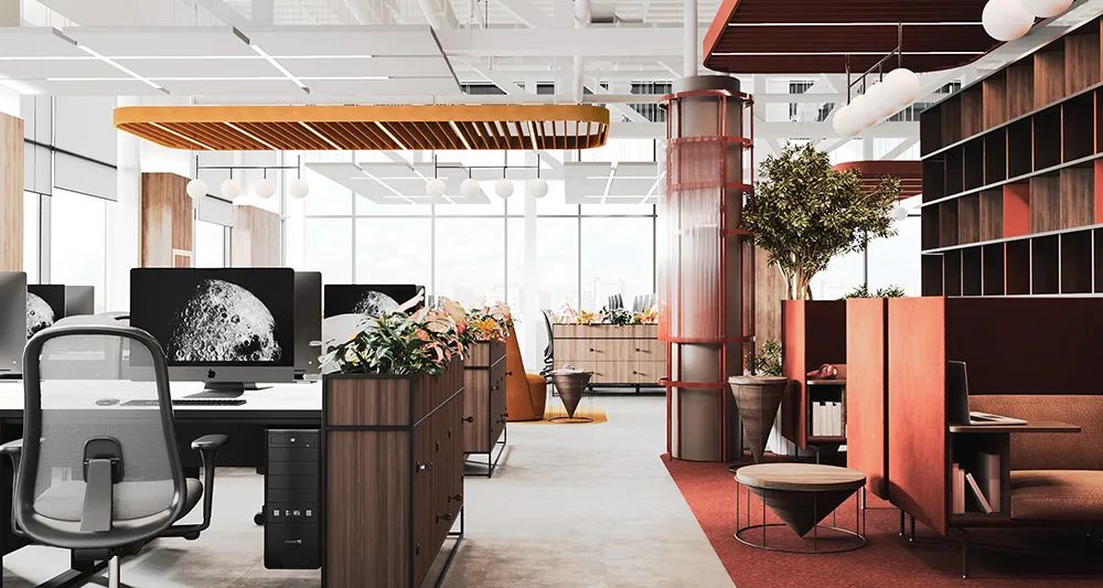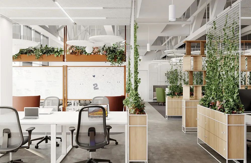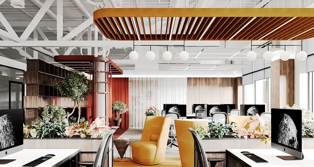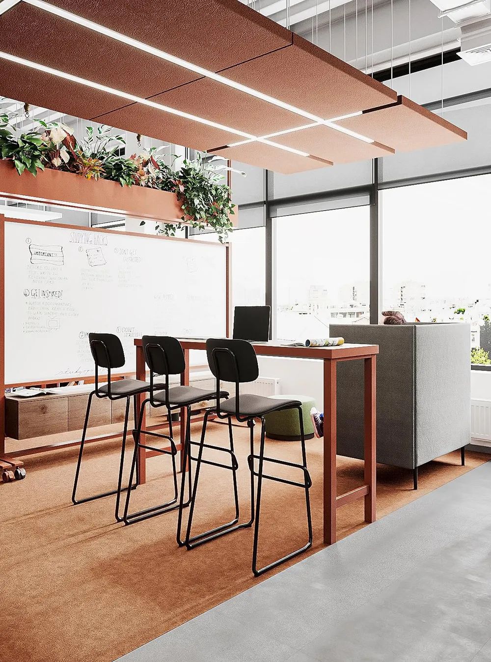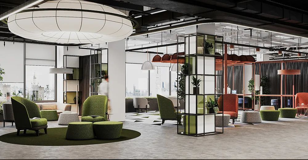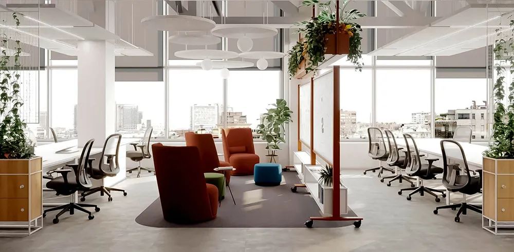 充足的自然光和声学材料应用是创建舒适办公环境的基础。因此工作场所配置了大量绿植隔断\隔屏\装饰、声学吊屏、声学灯具和磁性板等。