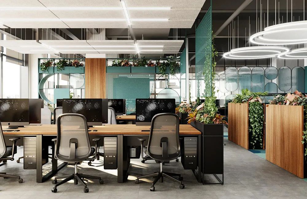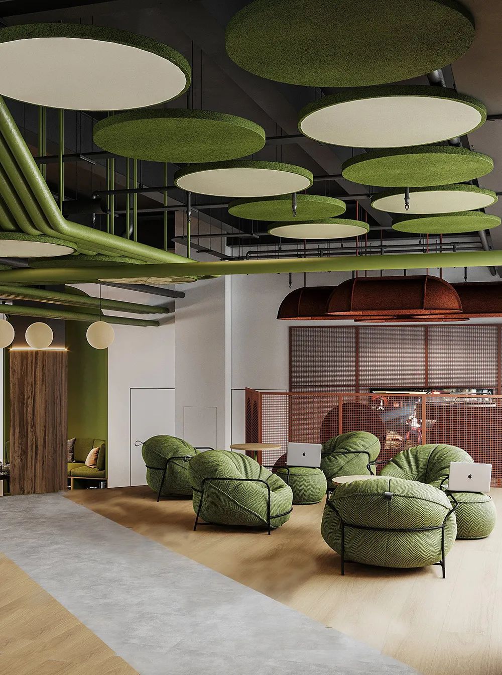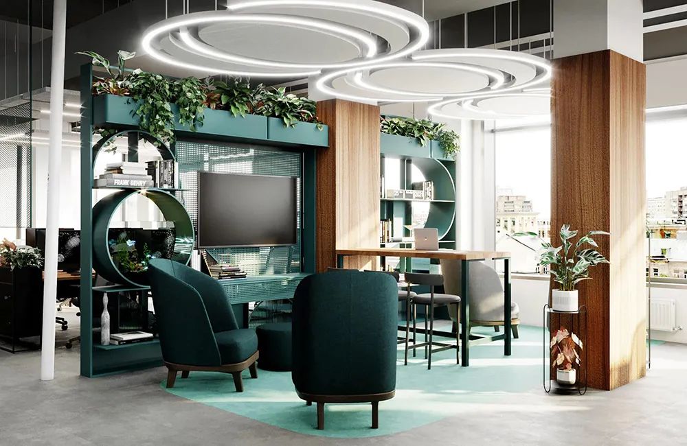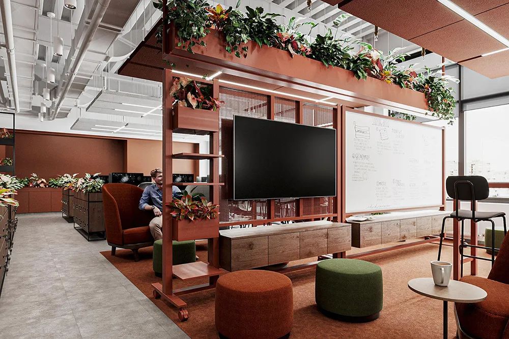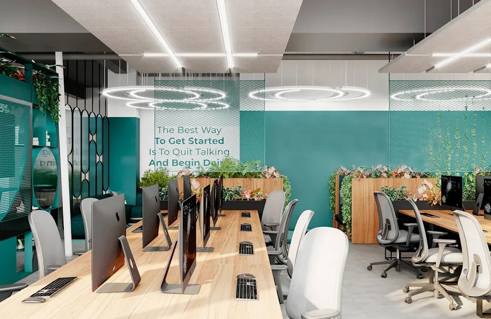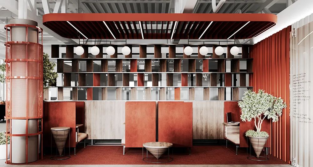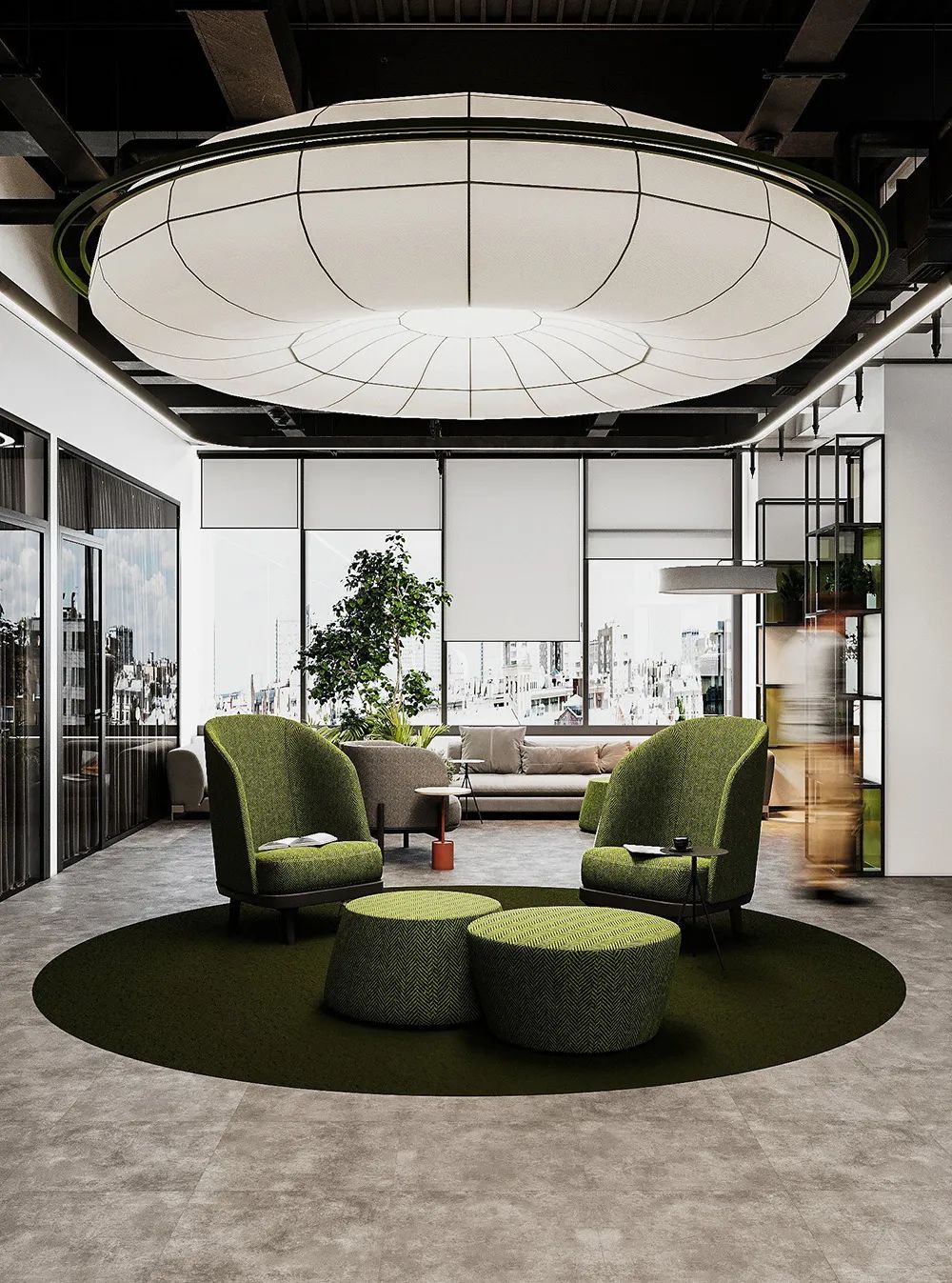 充足的自然光和声学材料应用是创建舒适办公环境的基础。因此工作场所配置了大量绿植隔断\隔屏\装饰、声学吊屏、声学灯具和磁性板等。