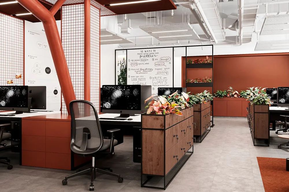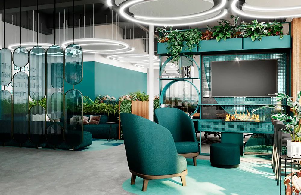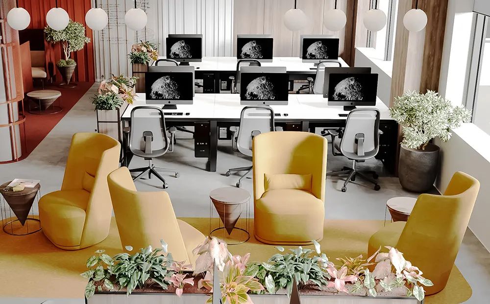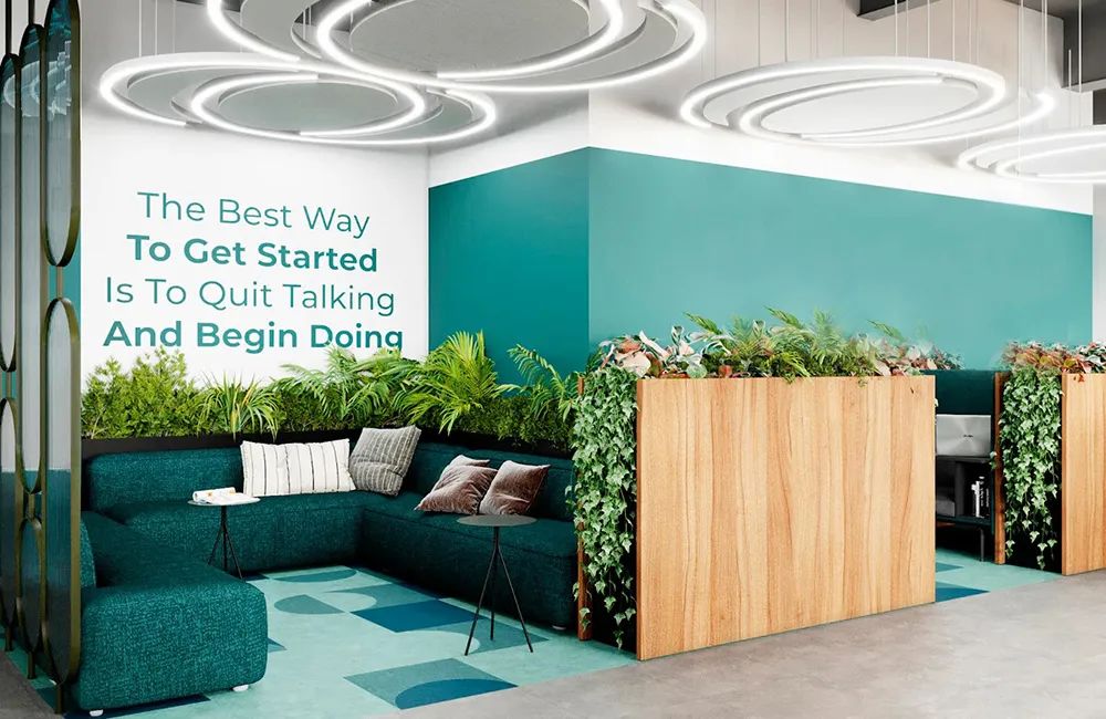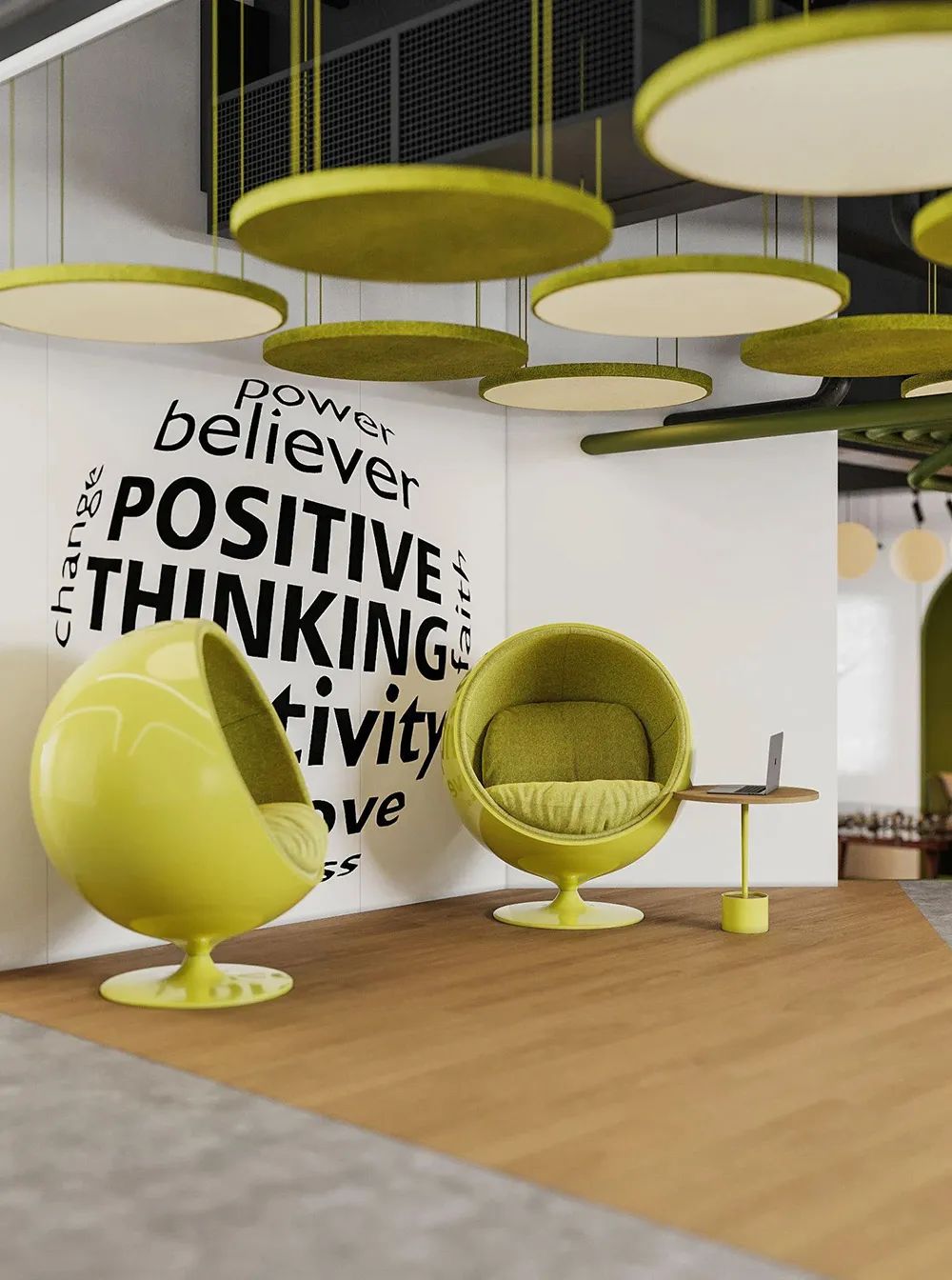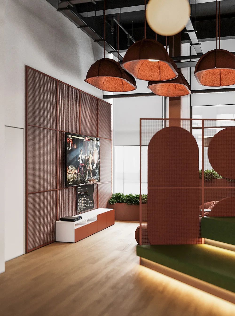 充足的自然光和声学材料应用是创建舒适办公环境的基础。因此工作场所配置了大量绿植隔断\隔屏\装饰、声学吊屏、声学灯具和磁性板等。
