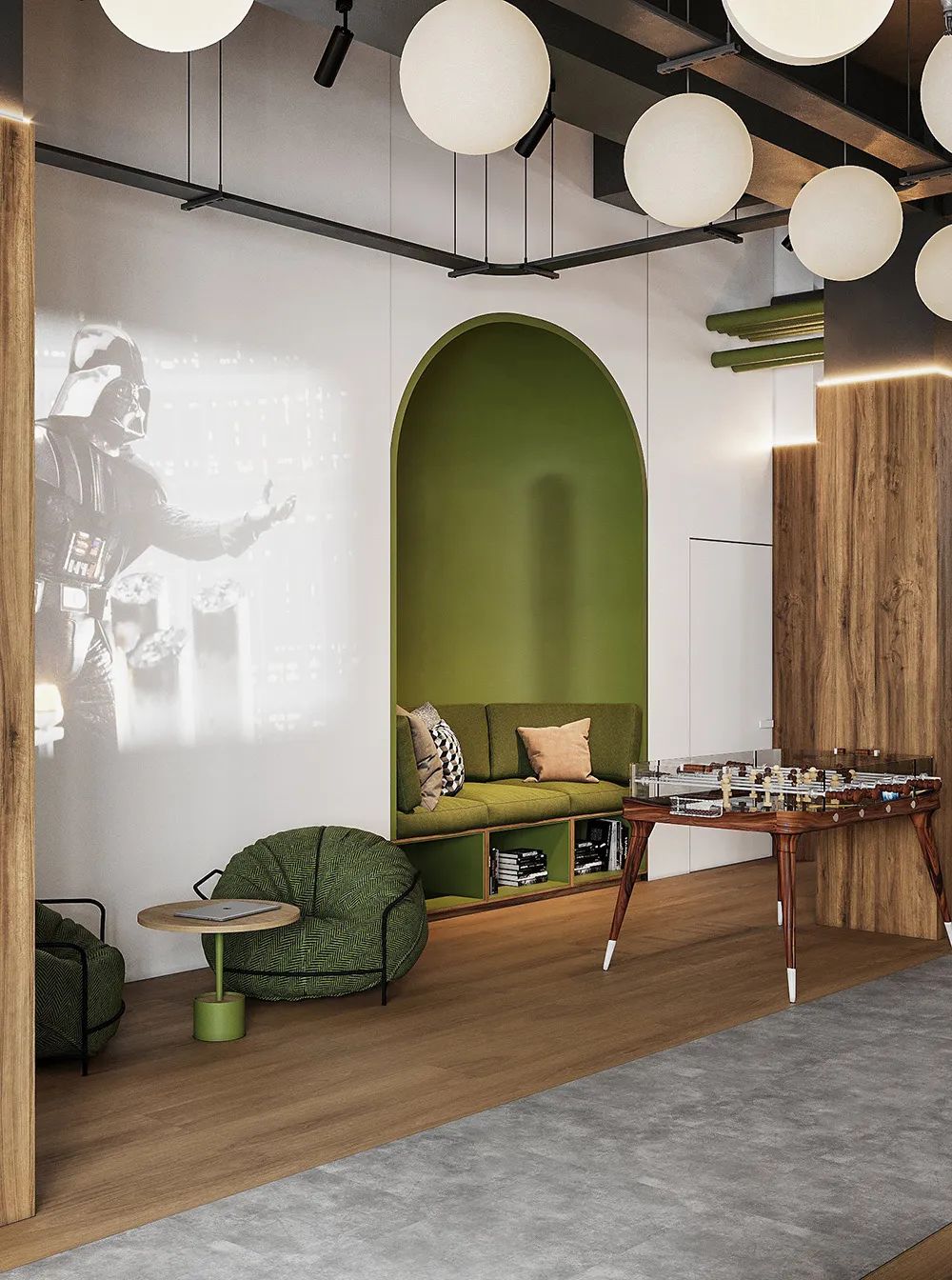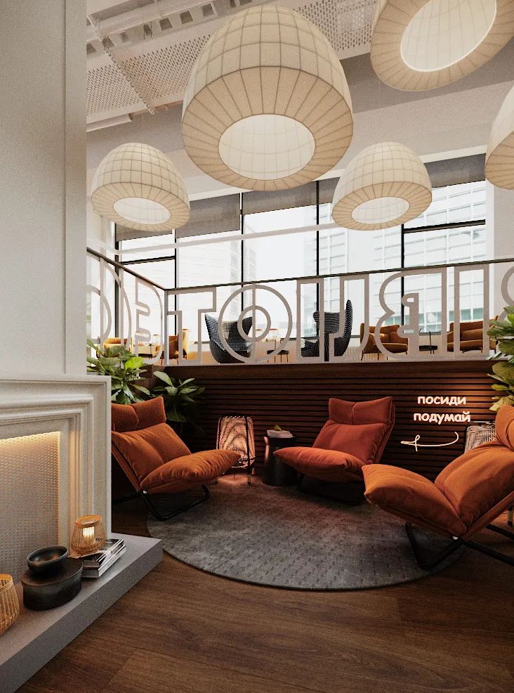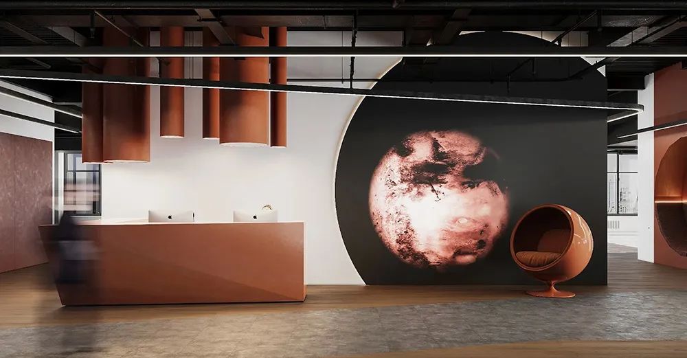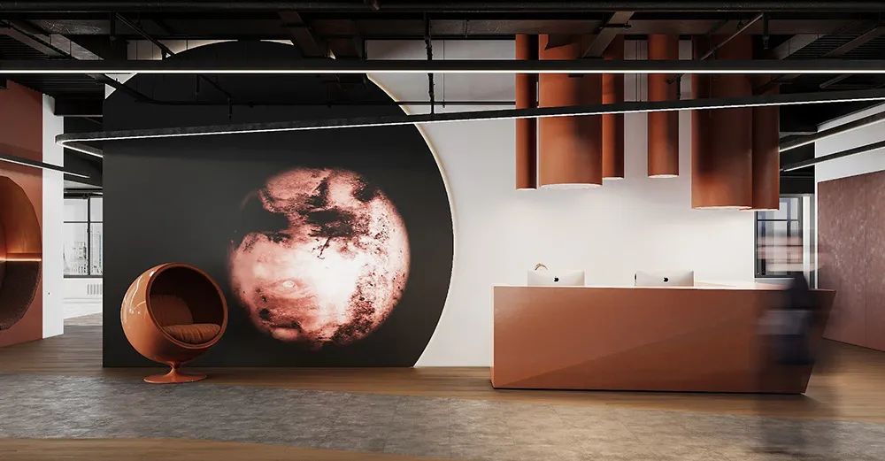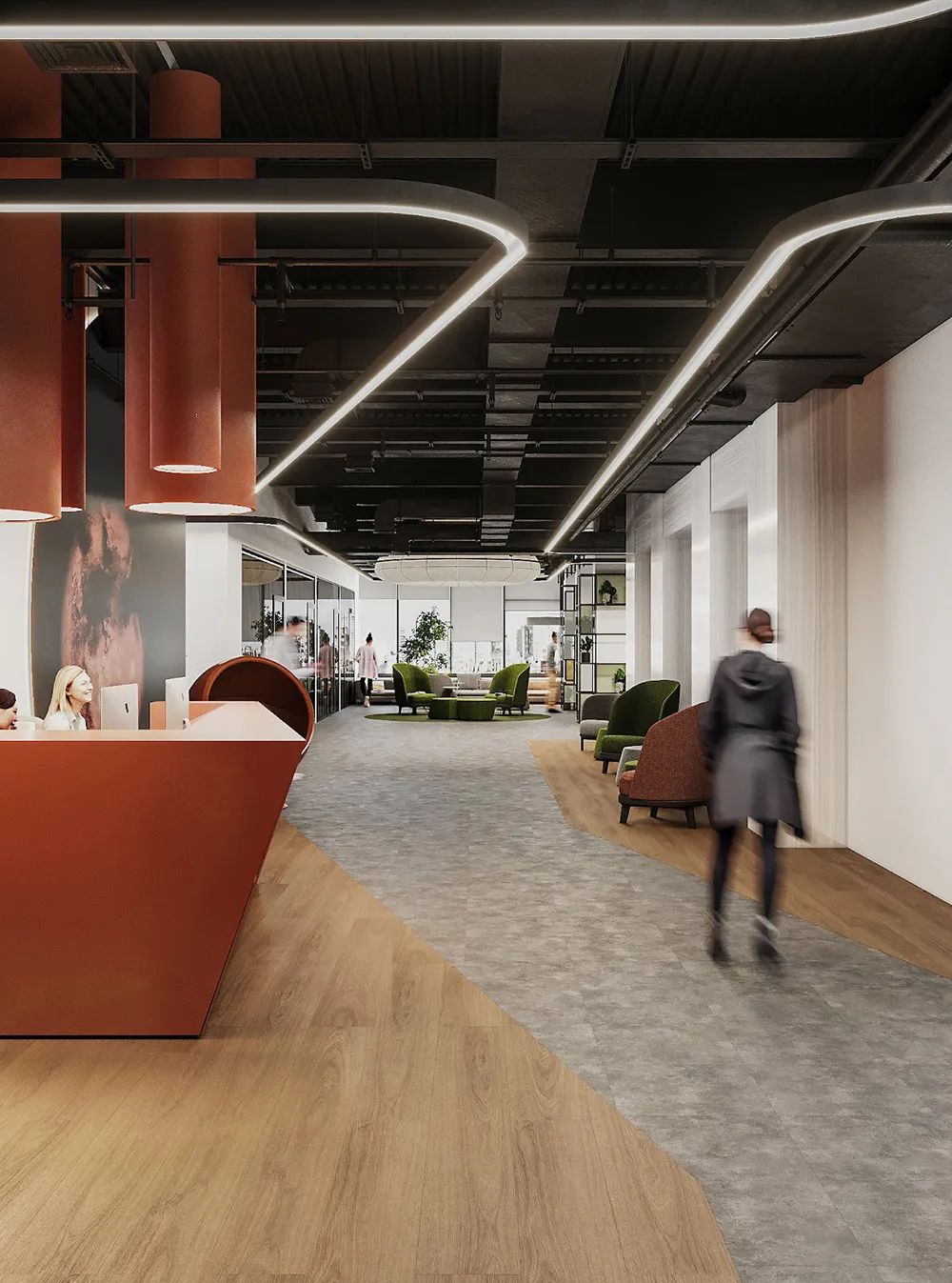 同时从整体配色上,如奶油色、赤陶色、橄榄色和实木的应用,去营造一个舒适高效的工作环境。并利用线性灯具从接待处一直延伸到内部开放空间,形成统一的视觉体系和整体感。