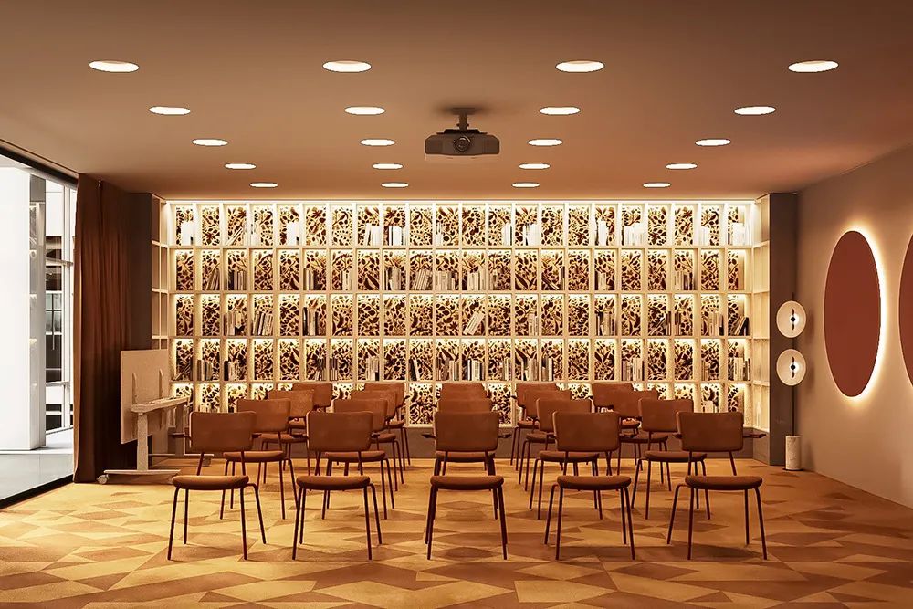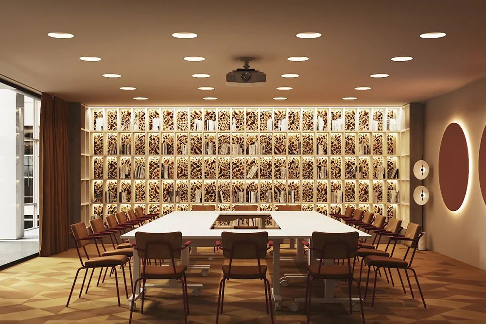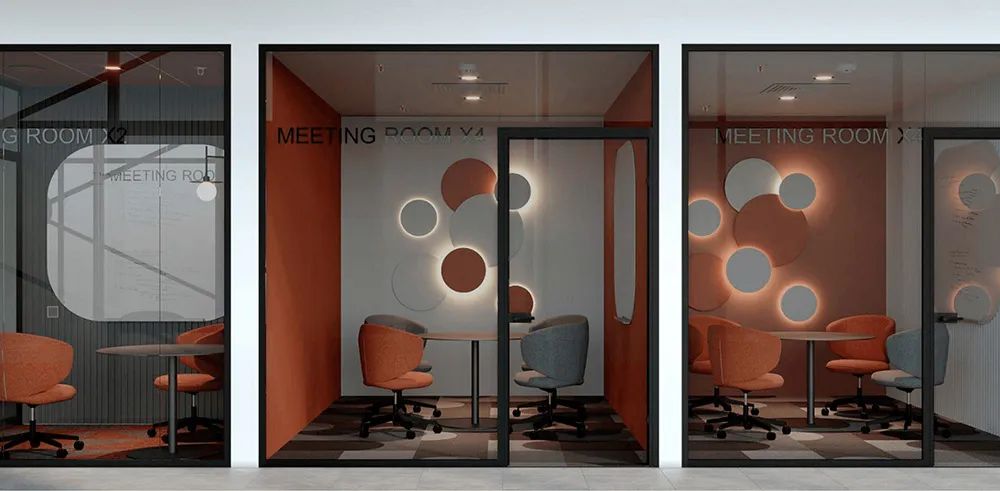 为了确保与合作伙伴或同事进行有效的沟通,设计团队开发了一个由55个会议室组成的复杂系统,可分别容纳2-4人至12-20人。不同形式的会议室组合显著提高了场所的功能性,将办公室的维护成本降低了30%。