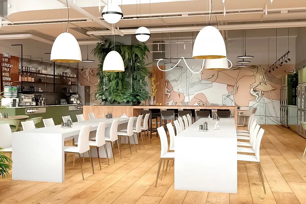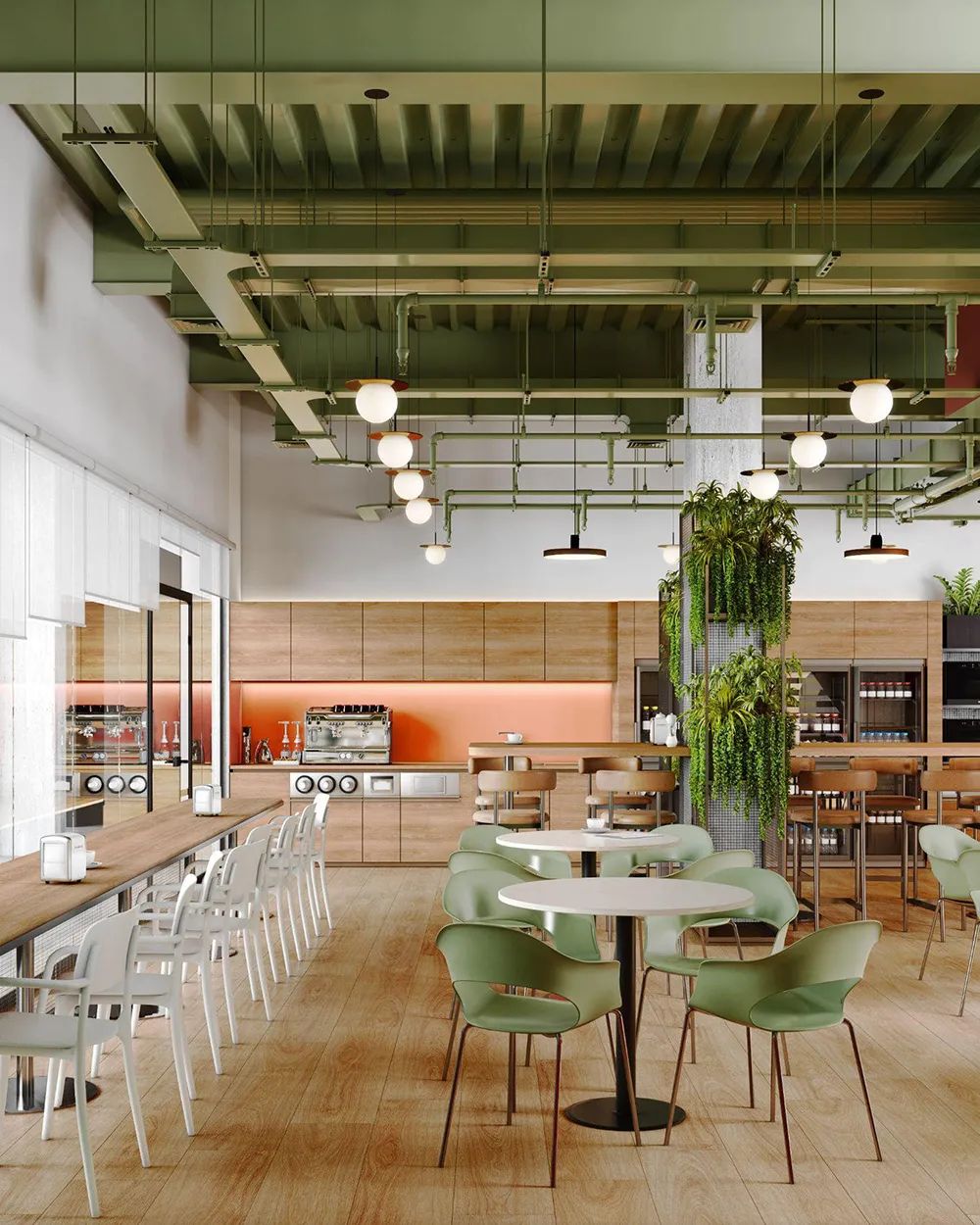 为了促进非正式交流,设计团队创建了几个不同形式的美食区——在长桌上一起举办趣味纷呈的披萨派对;在圆桌上与同事共进愉快的午餐;与同事坐在窗边的座位上一起喝着咖啡,边交流、边欣赏窗外美妙的风景。