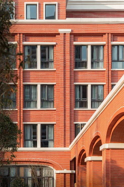 在设计上,该项目以学院派建筑风貌为蓝本,赋予学校独特的形象。主体建筑采用红砖材质,彰显历史感,同时融入学院派建筑的端庄气质,奠定园区的整体基调。建筑之间则通过充满韵律感的柱廊、拱券相连,建筑群落及连廊构成围合之势,将原先各自为政的单体建筑联结为一个整体,完美呈现整个园区的统一和谐之美。此外,在建筑的收分、压顶、窗框包边等细节之处,也处处体现品质与匠心。