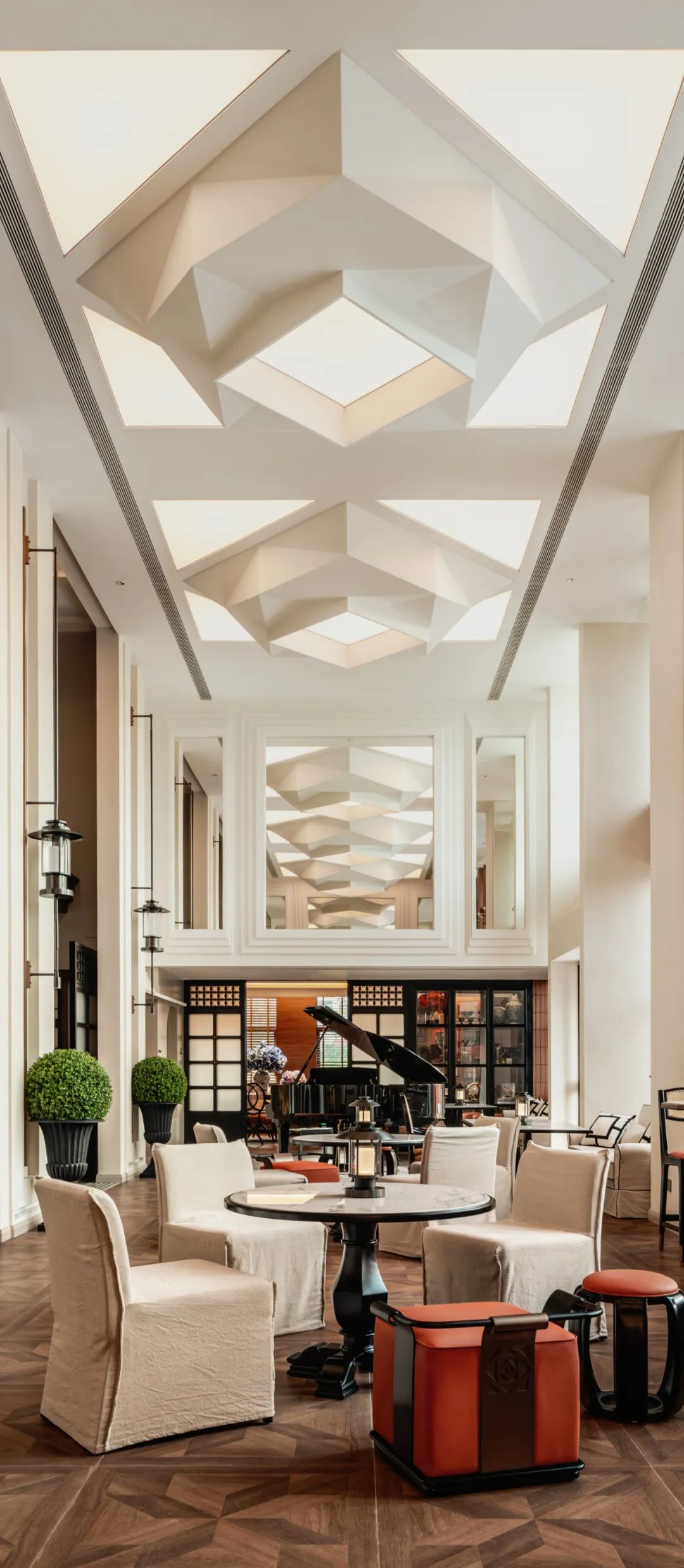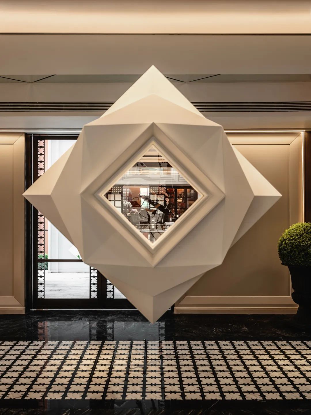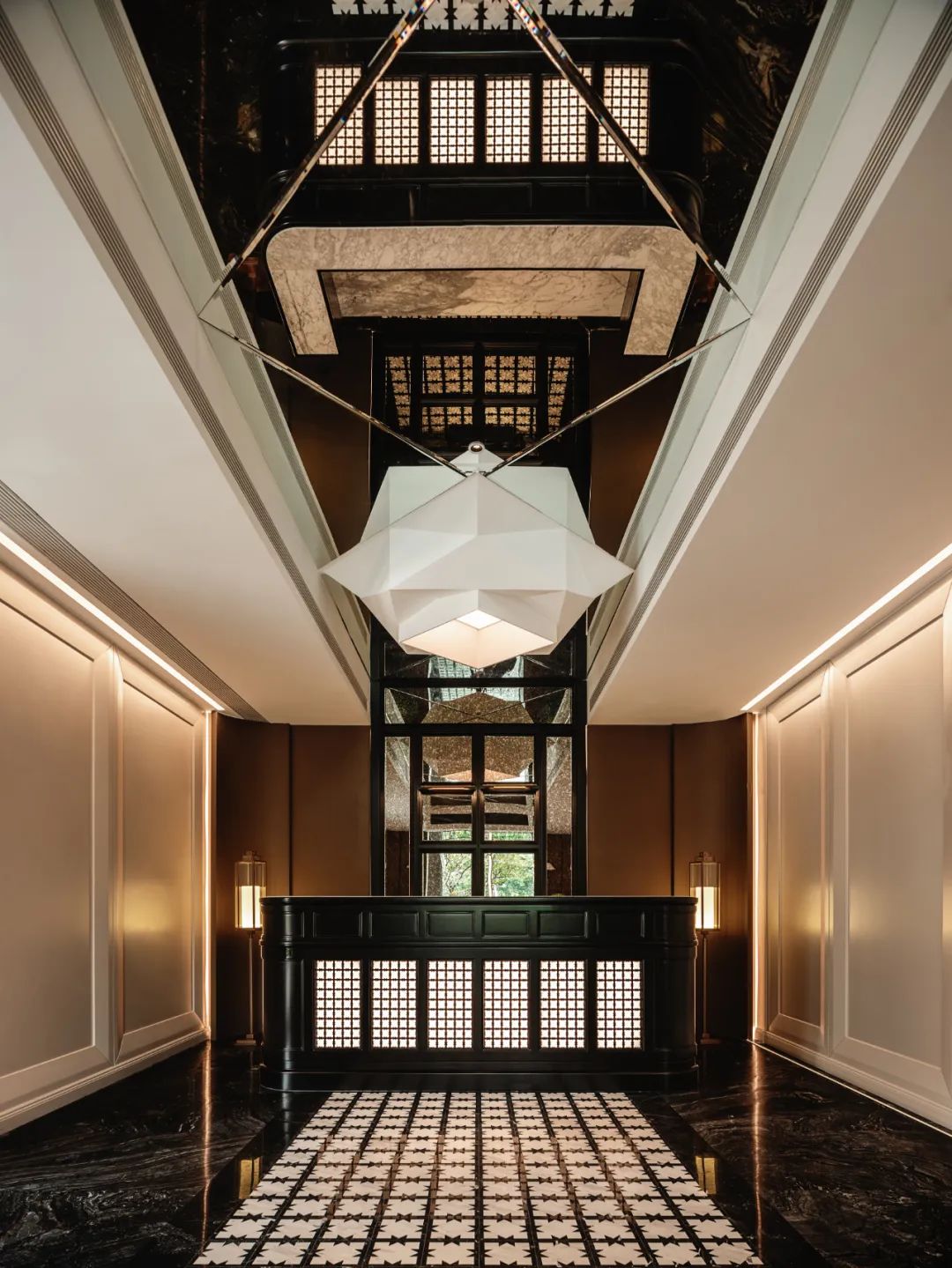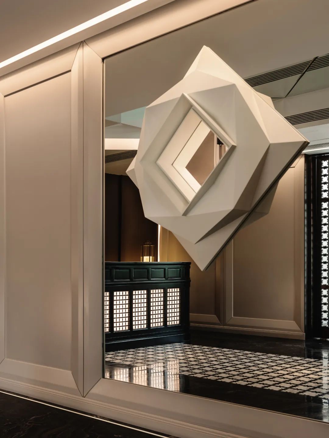 经过序廊,转入接待前厅【香隅】,经过设计重构的艺术装置——“绽放的百合”在此迎接宾客,这是品牌的符号,也是空间的IP。将品牌语言融入空间,激发对话,也能帮助客人建立品牌记忆。