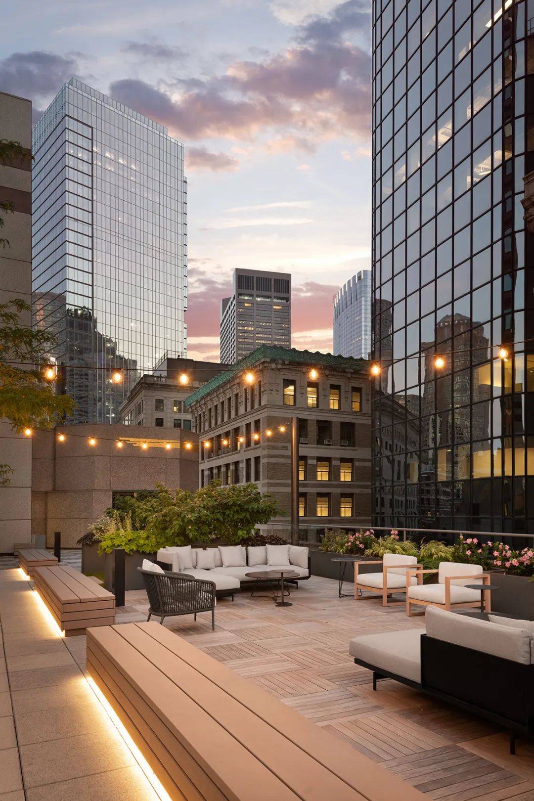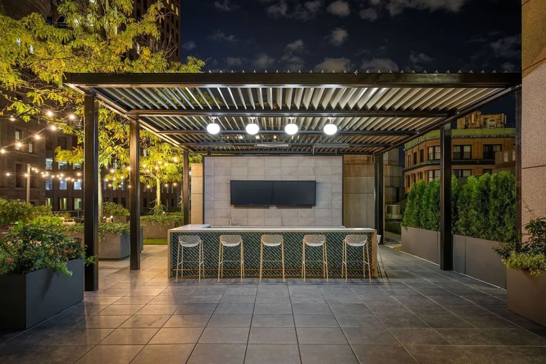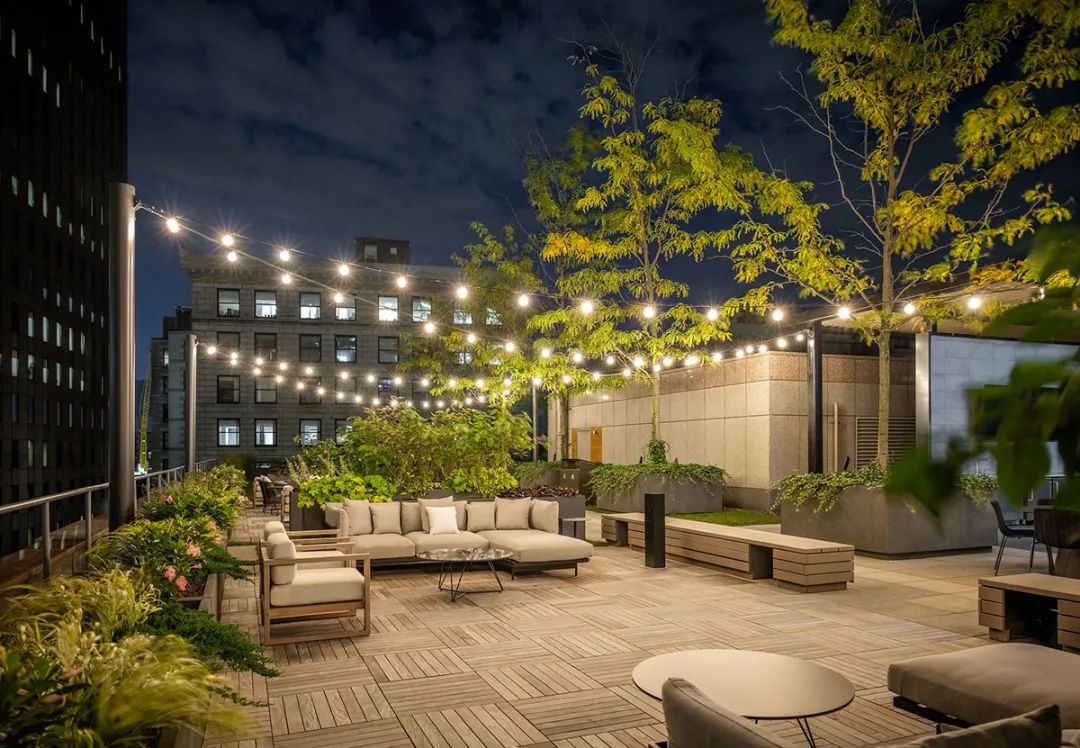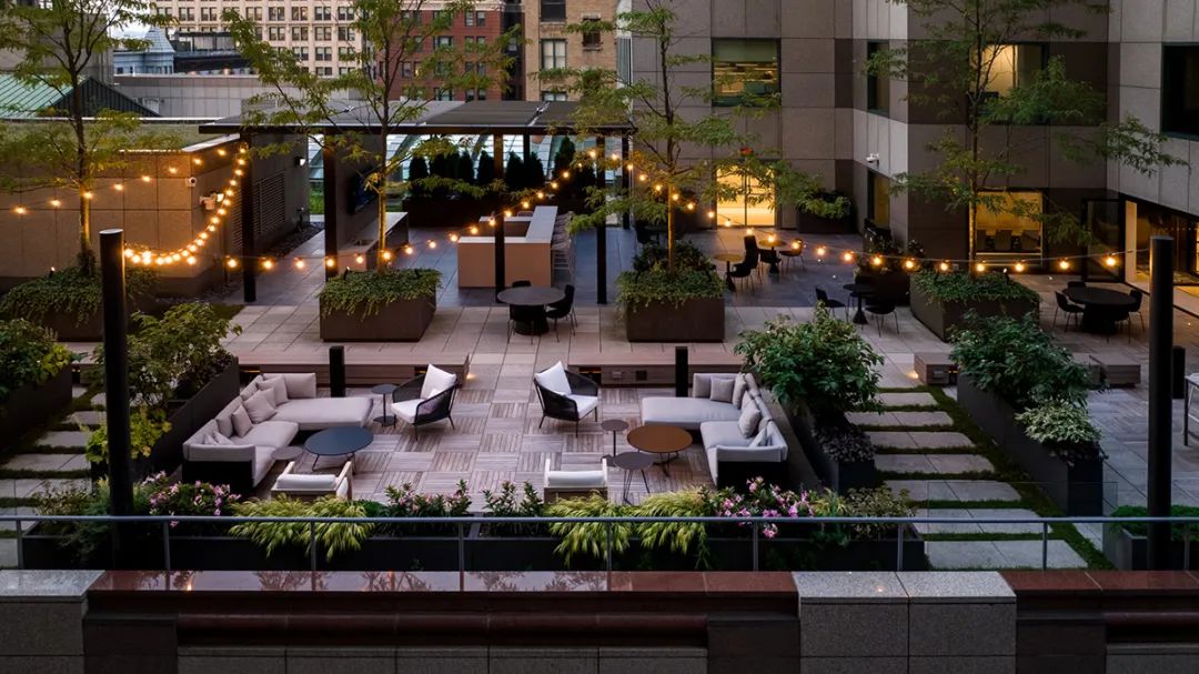 翻新改造屋顶露台和周边休闲区的主要目的是提高大楼内部目前空置空间的出租率,同时激活现有的休闲空间更好地服务于租户,用于举办活动、餐饮和各种员工聚会。屋顶露台的重新定位改变了整栋大楼(共七层)的面貌,将室内外空间完美地融合在一起,带来了迷人的空间体验。如今,室外区域有一处设施齐全的酒吧、并配备了大量的休闲桌椅,是举办公司活动和聚会的理想场所。露台两旁的树木经过精心设计,焕发出勃勃生机,迷人的串珠灯在树木之间优雅地穿联并焕发出温暖的光芒,整个环境洋溢着时尚的都市气息。
