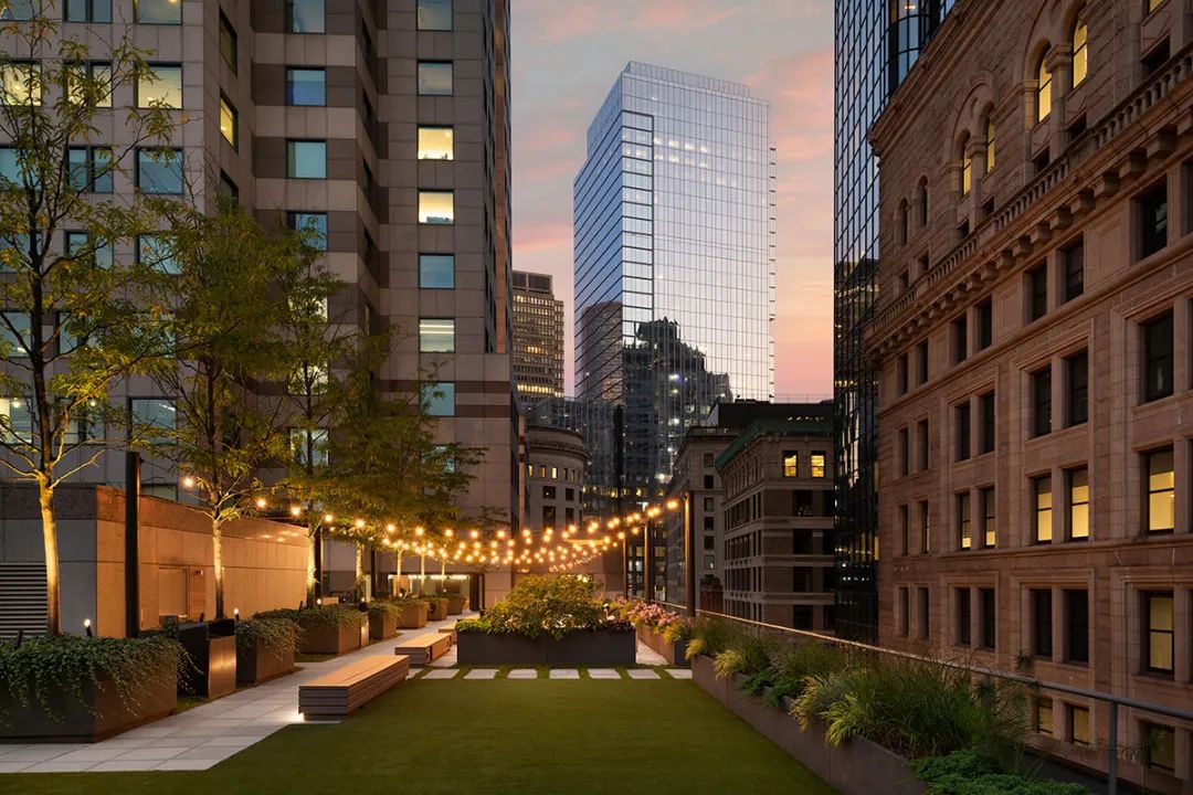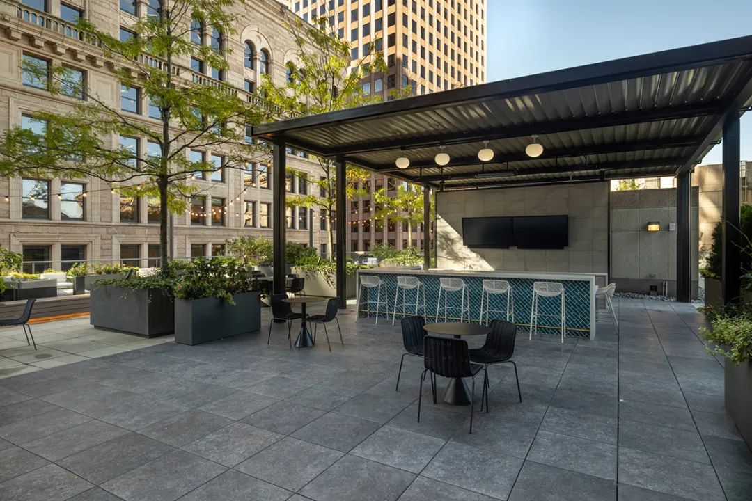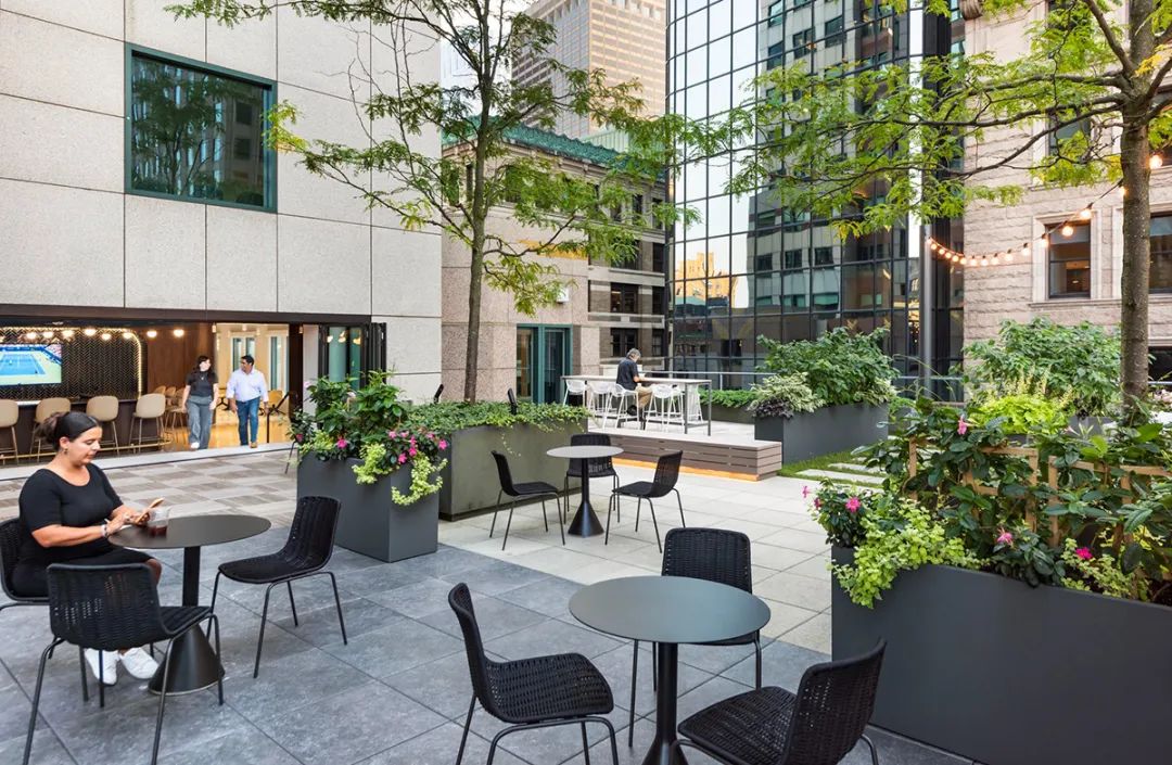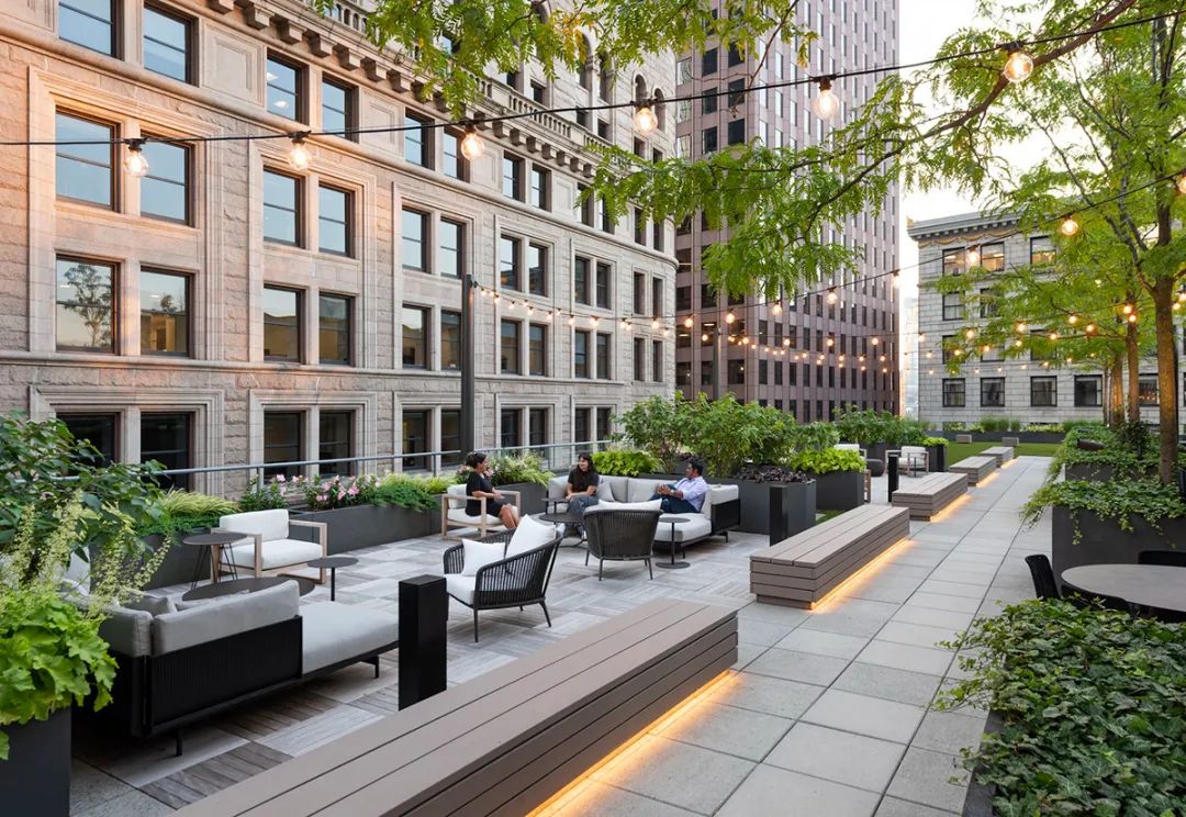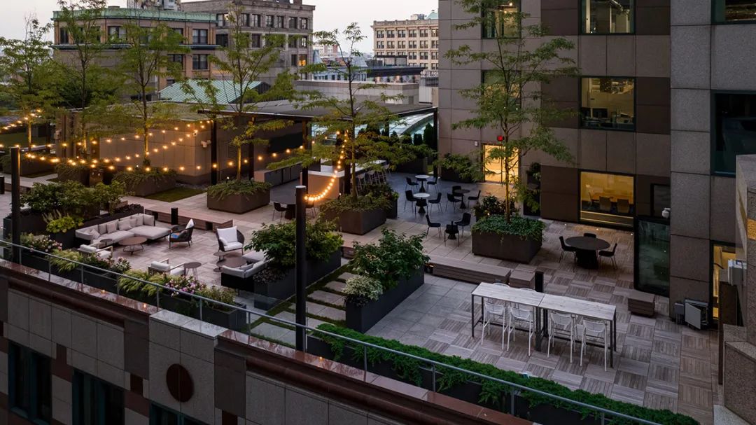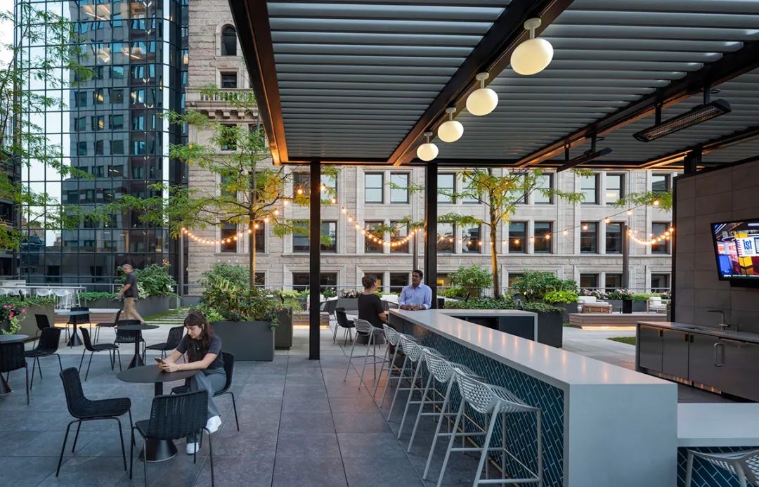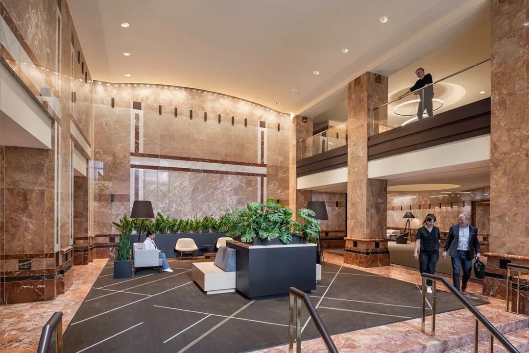 从焕然一新的屋顶露台、以及绿树围绕的室外酒吧,到向这幢大楼建筑主题致敬的花园般大厅,建筑的每一个细节都经过了精心考量。最终完成的空间不仅满足了租户的实际需求,也大大提升了他们的体验,为工作、休闲和社区建设提供了一个温馨且迷人的生活环境。通过设计策略将一幢陈旧的大楼打造成具备吸引力的时尚场所,本案成为如何以设计振兴和活跃城市空间的典范。