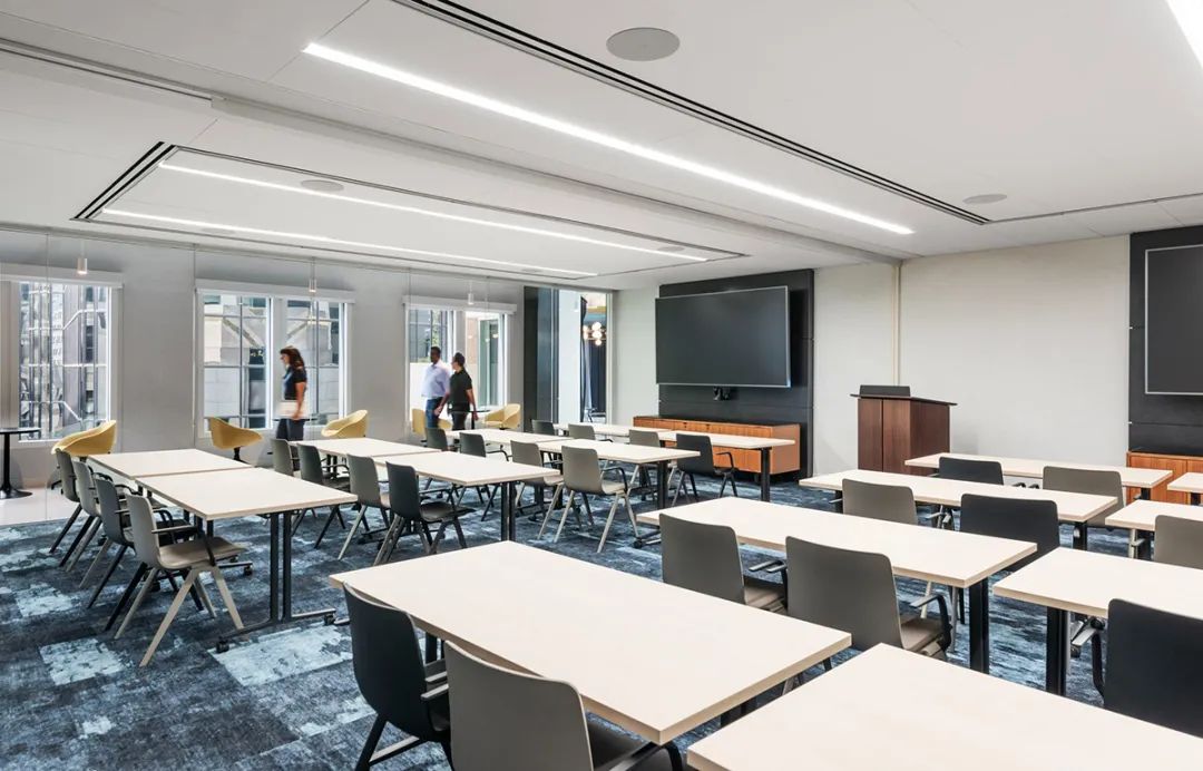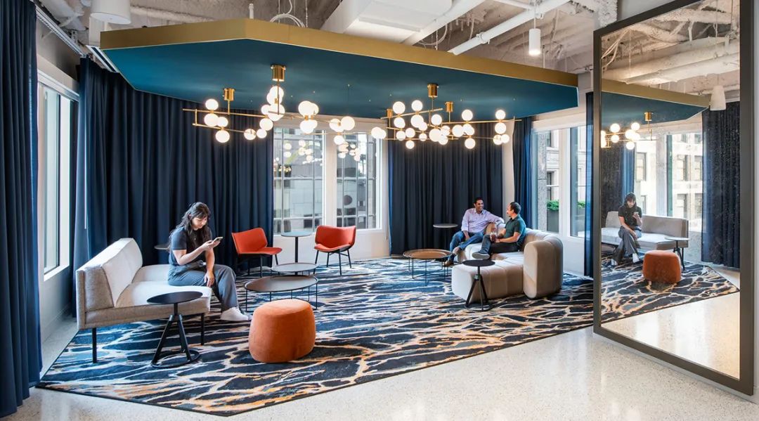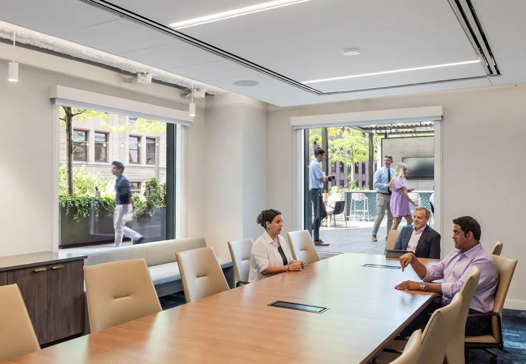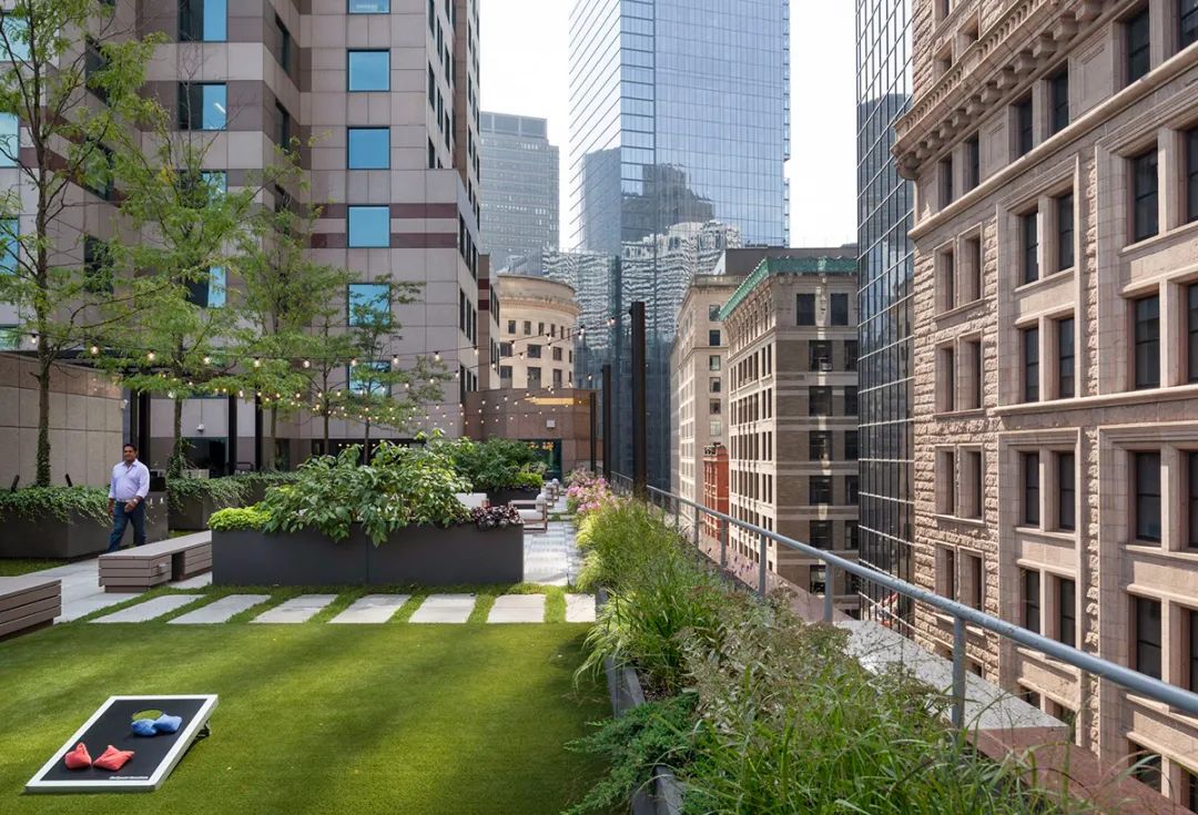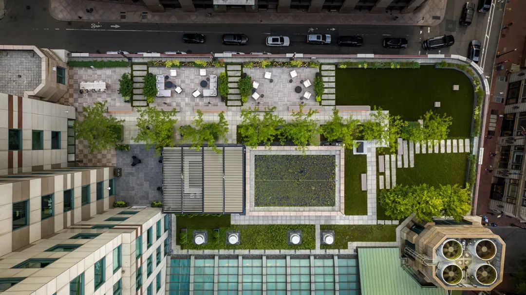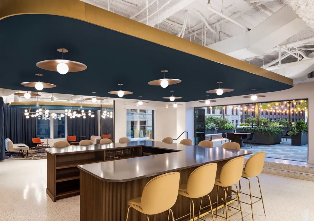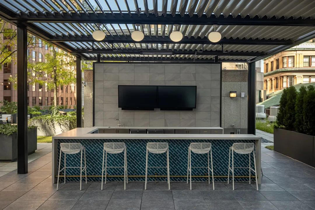 从焕然一新的屋顶露台、以及绿树围绕的室外酒吧,到向这幢大楼建筑主题致敬的花园般大厅,建筑的每一个细节都经过了精心考量。最终完成的空间不仅满足了租户的实际需求,也大大提升了他们的体验,为工作、休闲和社区建设提供了一个温馨且迷人的生活环境。通过设计策略将一幢陈旧的大楼打造成具备吸引力的时尚场所,本案成为如何以设计振兴和活跃城市空间的典范。
